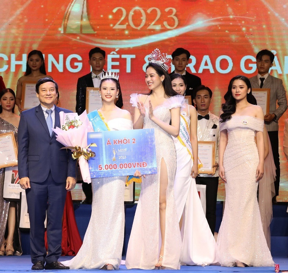 | Thanh Thủy làm giám khảo trong một cuộc thi Hoa khôi. |