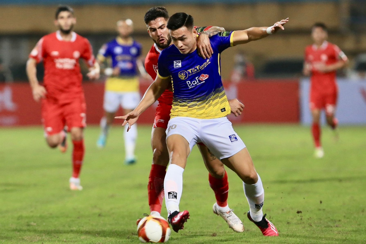 Phút 50: Hà Nội đang cố vùng lên, nhưng những đường phát triển bóng dài từ tuyến dưới của họ chưa mang lại hiệu quả.