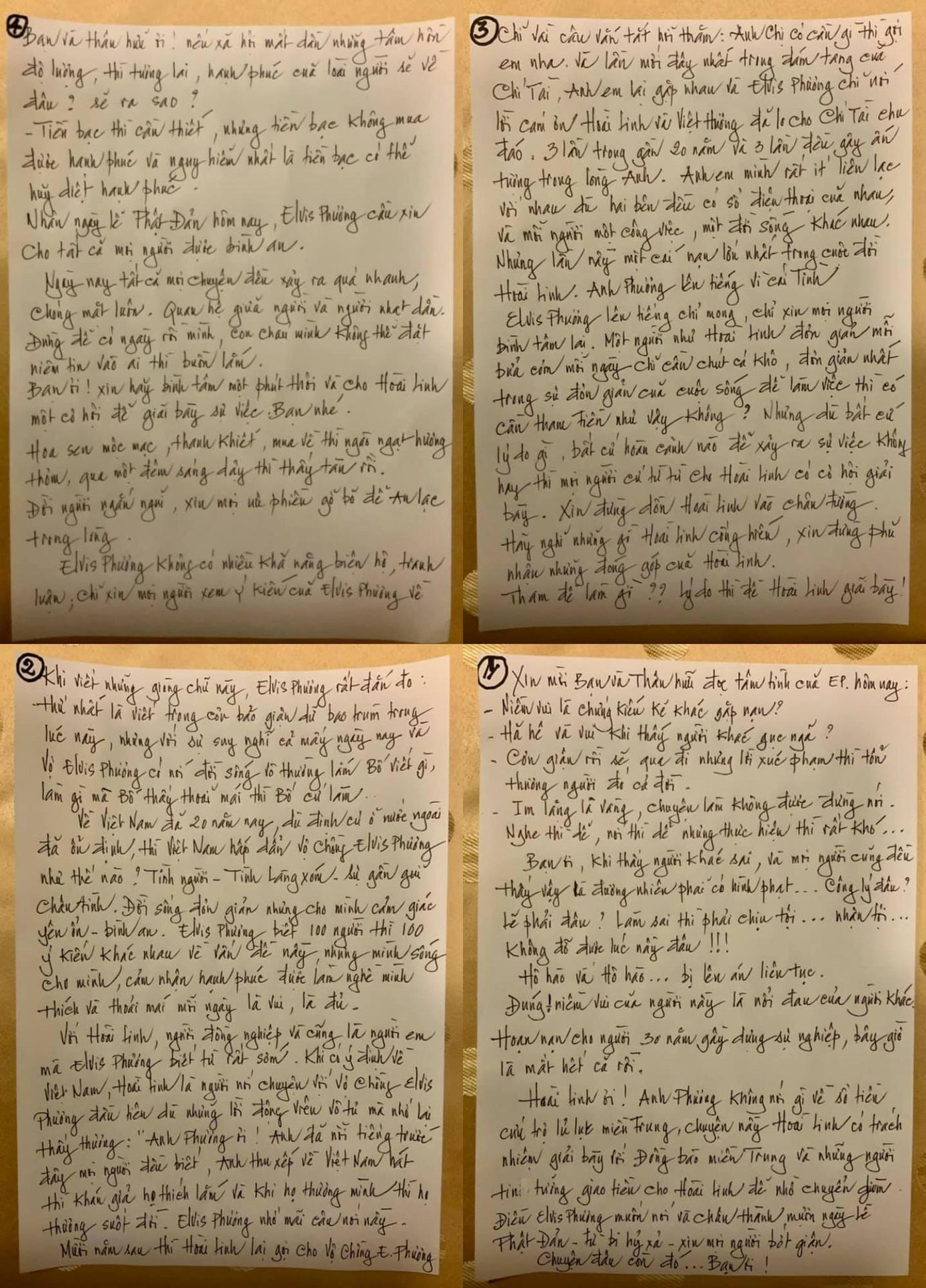 Hoài Linh ơi! Anh Phương không nói gì về số tiền cứu trợ lũ lụt miền Trung. Chuyện này Hoài Linh có trách nhiệm giãi bày với đồng bào miền Trung và những người tin tưởng giao tiền cho Hoài Linh để nhờ chuyển giùm. Điều Elvis Phương muốn nói và chân thành mượn ngày lễ Phật Đản - từ bi hỷ xả - xin mọi người bớt giận. Chuyện đâu còn có đó.... Bạn ơi!