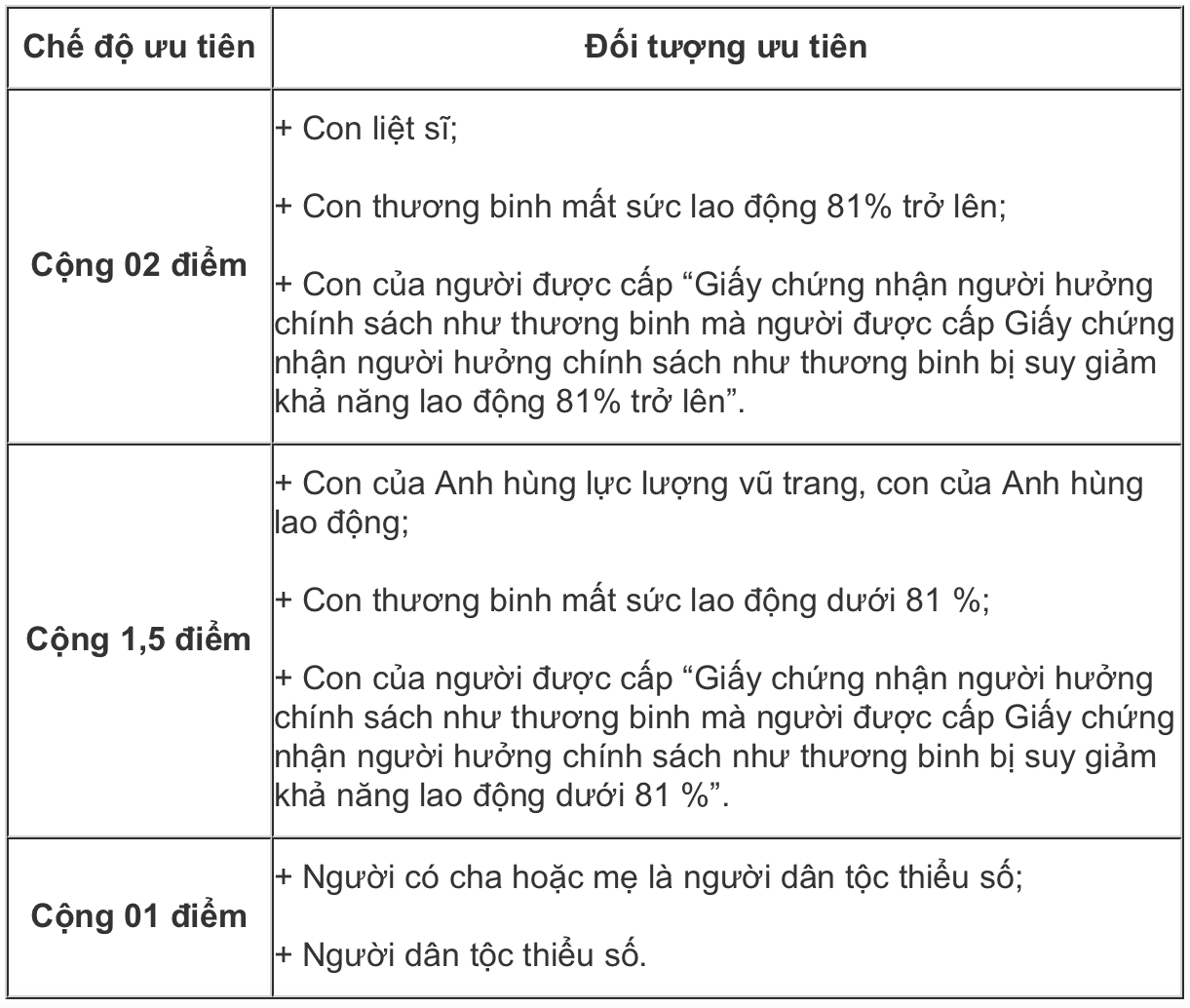 Lưu ý: Điểm cộng thêm cho đối tượng được hưởng chế độ ưu tiên tối đa không quá 3 điểm.