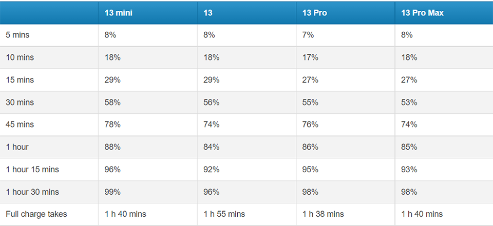 Điều thú vị là sự khác biệt về tốc độ sạc thực tế không quá lớn như bạn có thể mong đợi và iPhone 13 Pro Max có thời sạc đầy tương đồng với các mẫu iPhone 13 khác dù sở hữu viên pin dung lượng lớn hơn khá nhiều. Dưới đây là bảng thời gian sạc đầy của 4 chiếc iPhone mới: