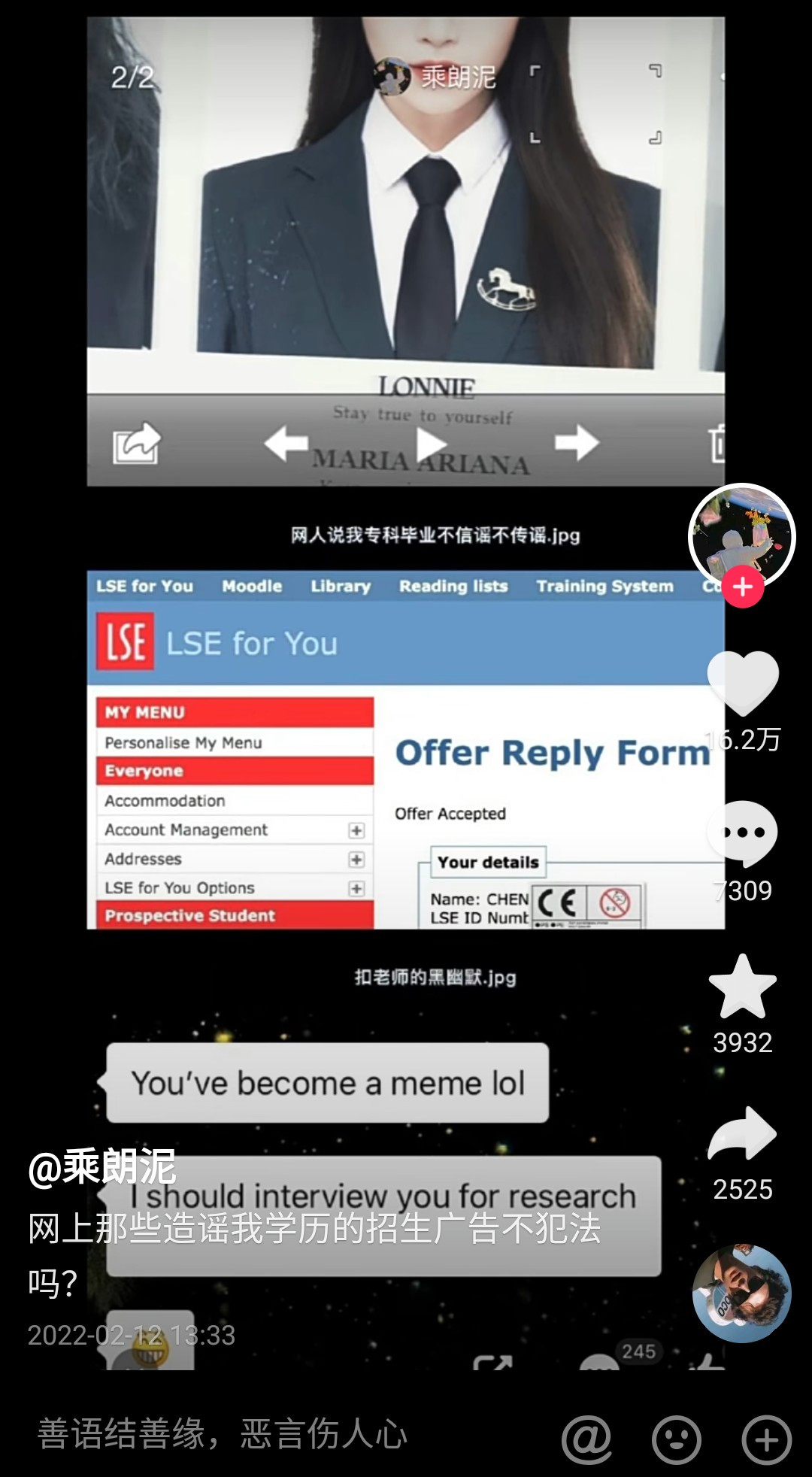 Trong gần nửa năm sau đó, Thừa Lãng Nê đã im hơi lặng tiếng và ít cập nhật thông tin trên mạng xã hội. Đến tháng 2/2022, cô bất ngờ đáp trả bằng video minh chứng cô đang theo học Thạc sĩ tại Học viện Kinh tế và Chính trị London.
