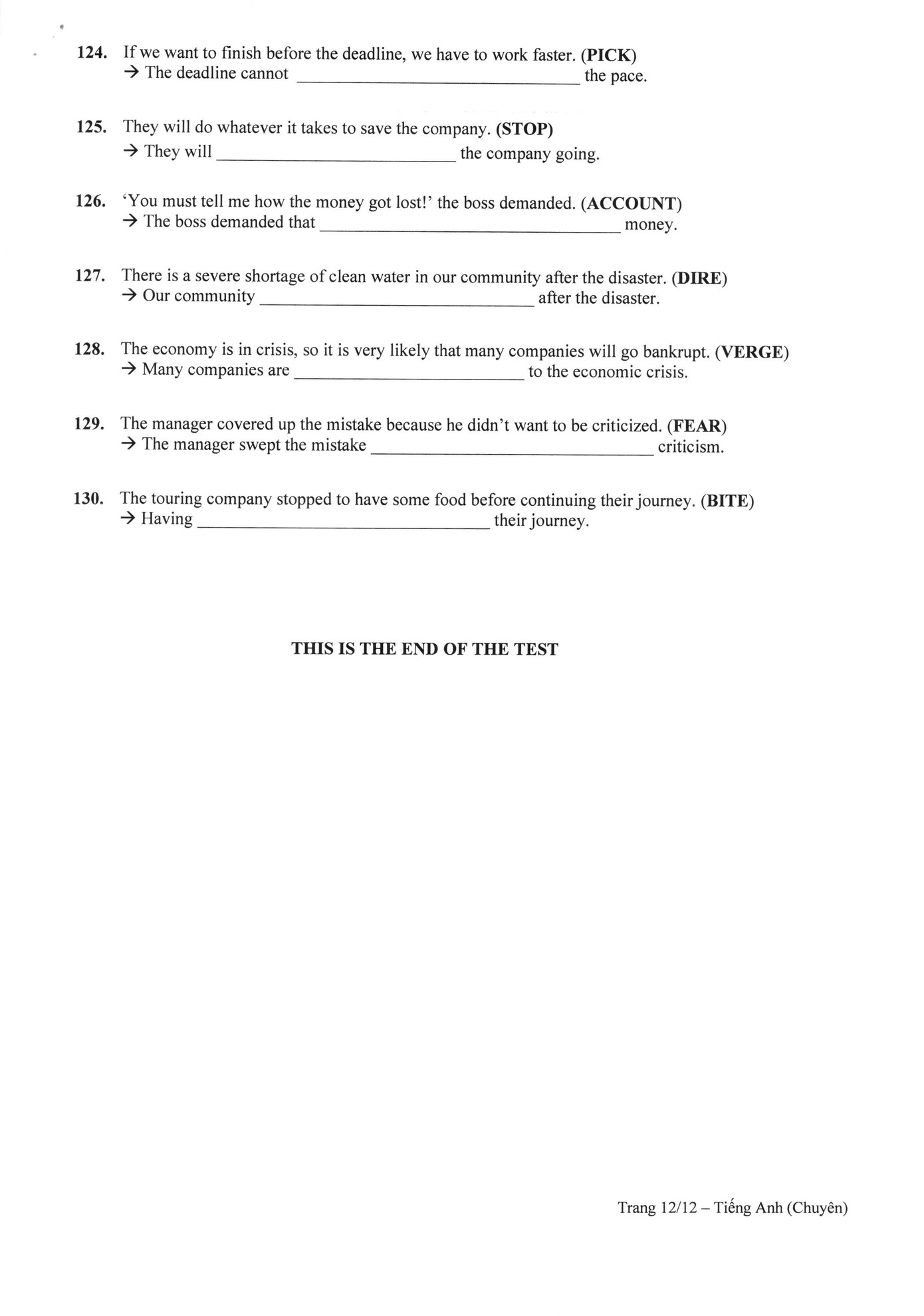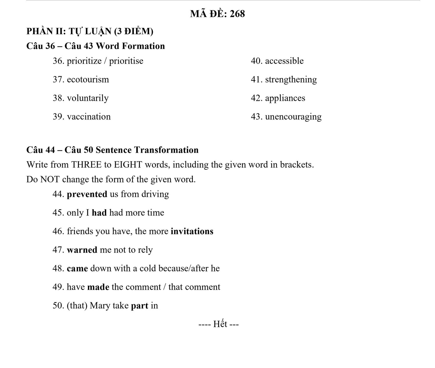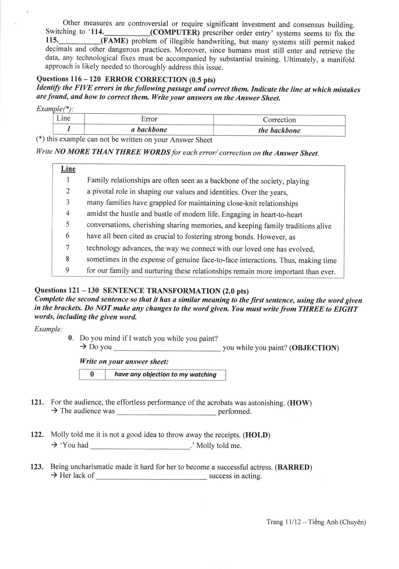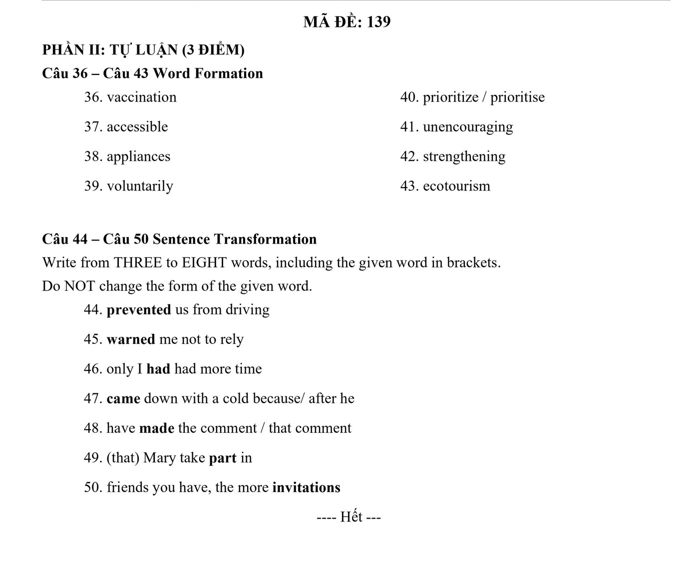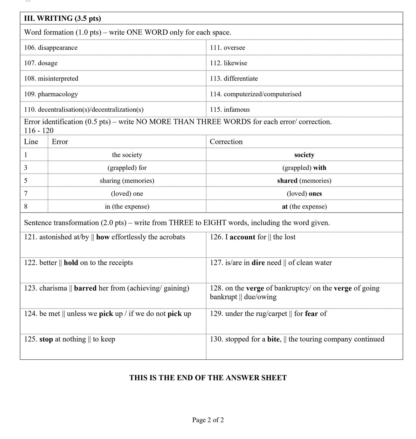 - Phần Sentence transformation: Cần tuân thủ quy tắc viết hoa (đầu câu, tên riêng, v.v...) và chấm câu đầy đủ (phẩy (,) chấm (.)) theo đáp án thì mới được tính đúng.