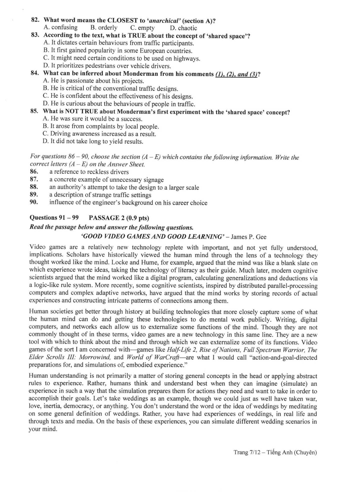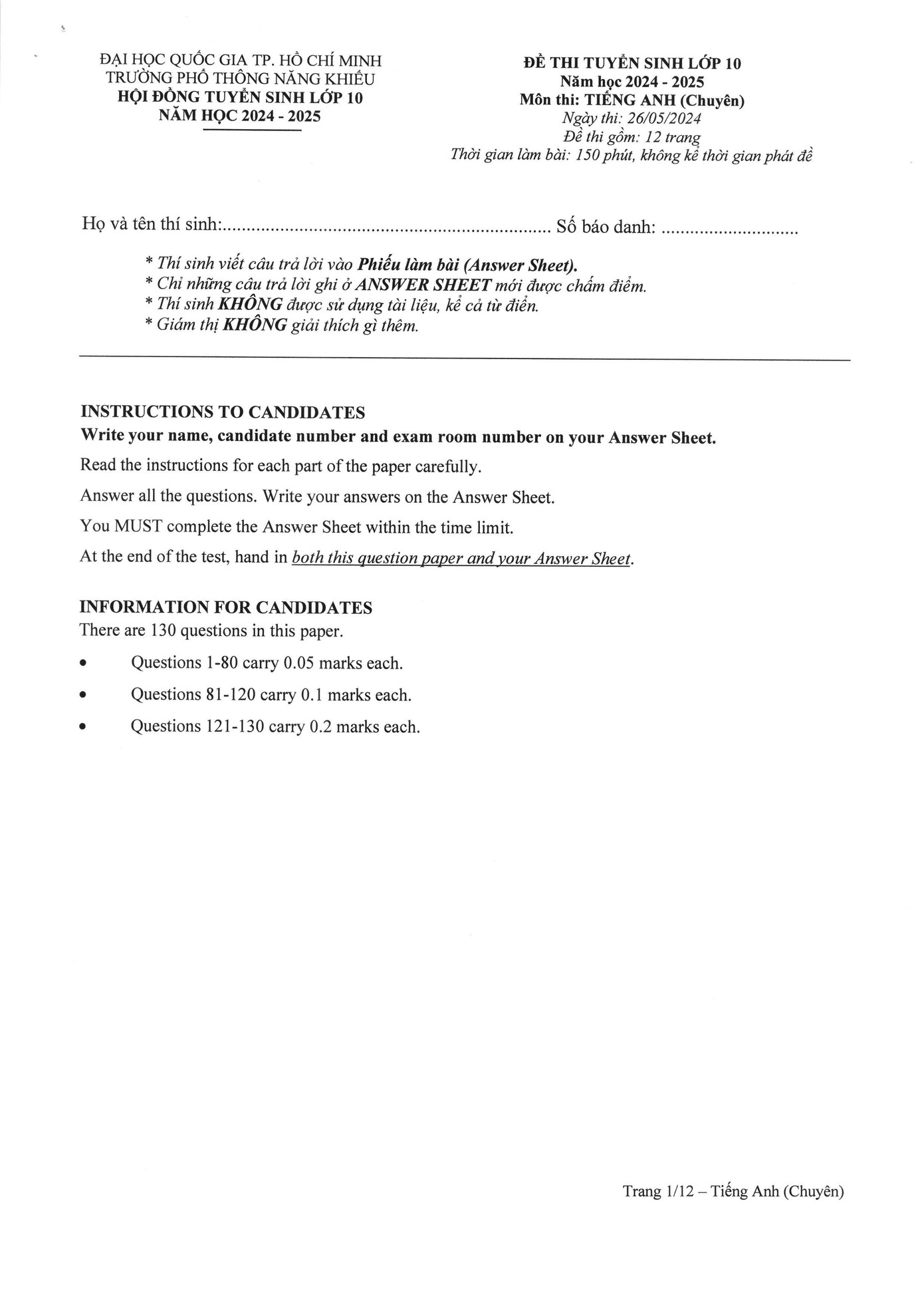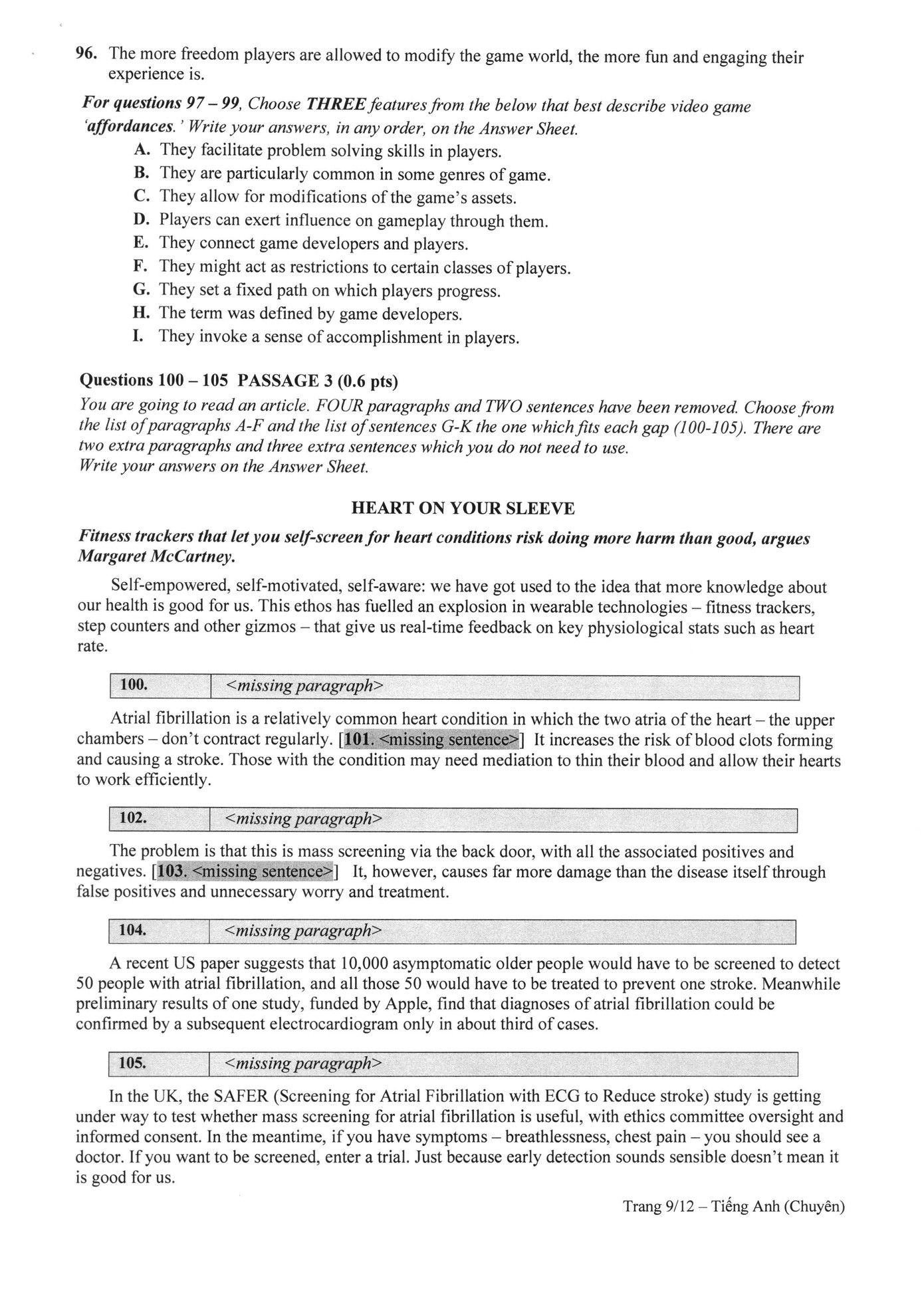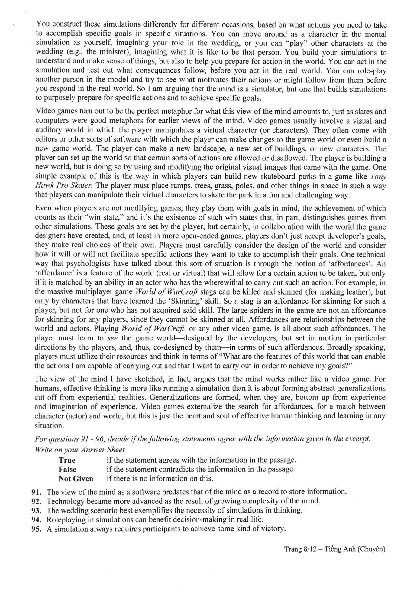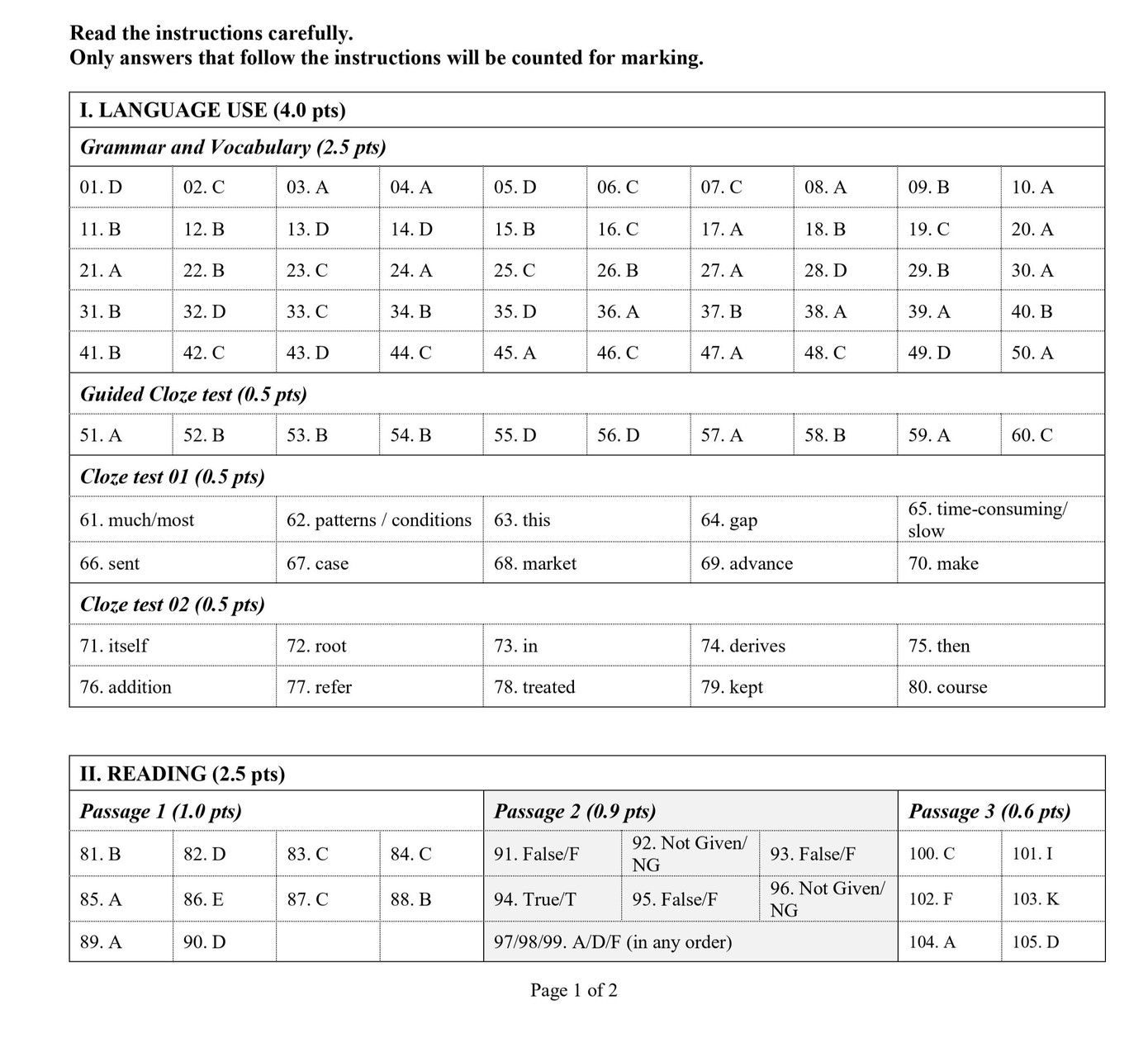 - Phần Passage 2 (đề chuyên): Thí sinh có thể viết tắt (F cho False, T cho True, NG cho Not Given). Câu 97/98/99 thí sinh điền đáp án theo thứ tự nào cũng được cho điểm.