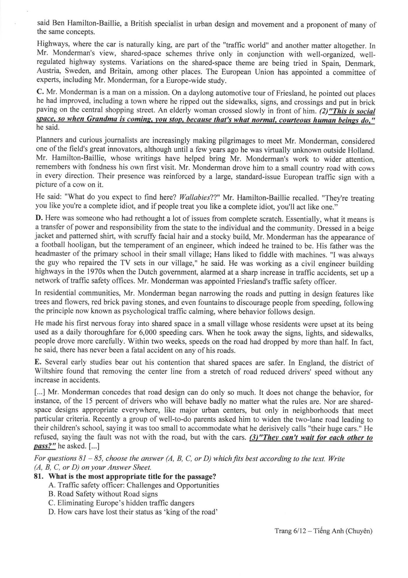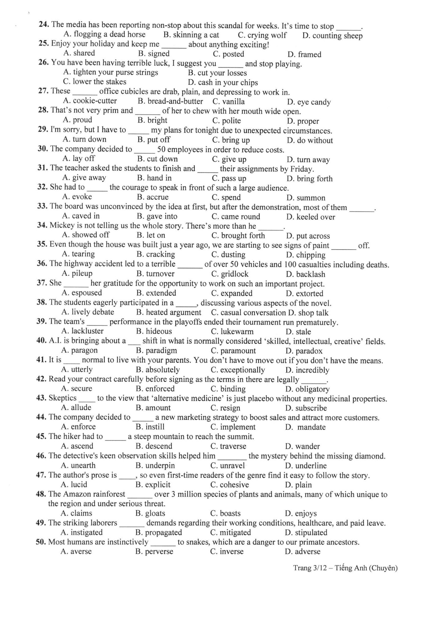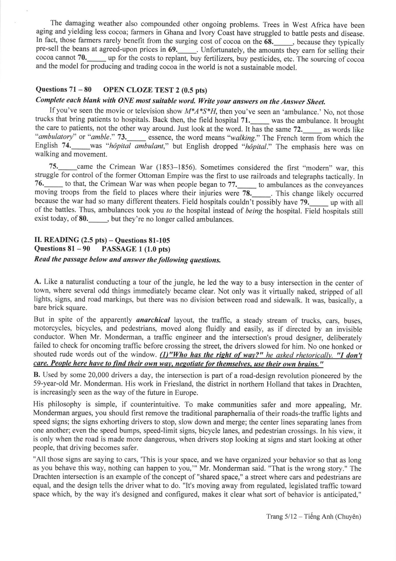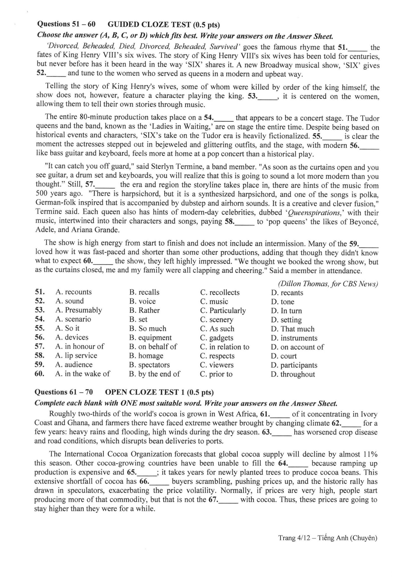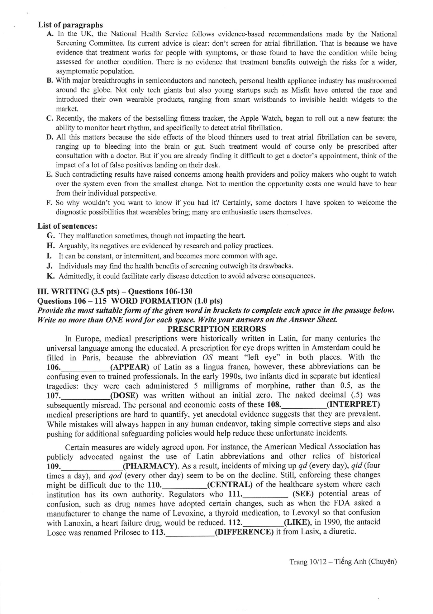 - Phần Passage 2 (đề chuyên): Thí sinh có thể viết tắt (F cho False, T cho True, NG cho Not Given). Câu 97/98/99 thí sinh điền đáp án theo thứ tự nào cũng được cho điểm.