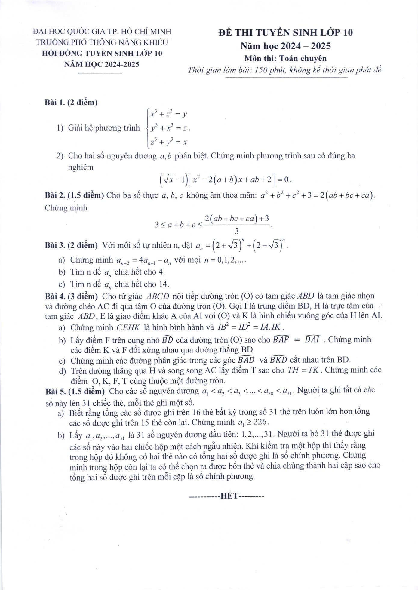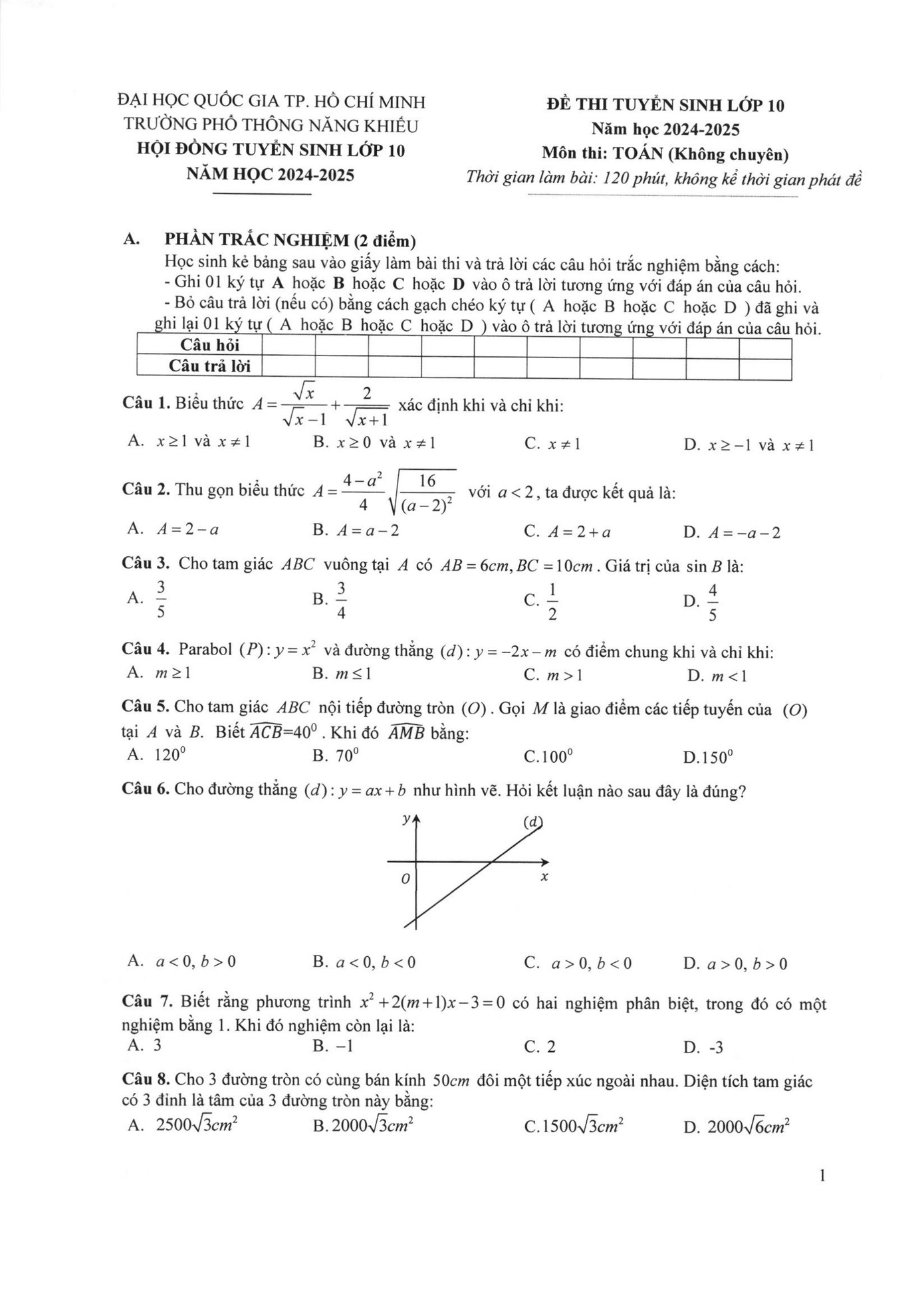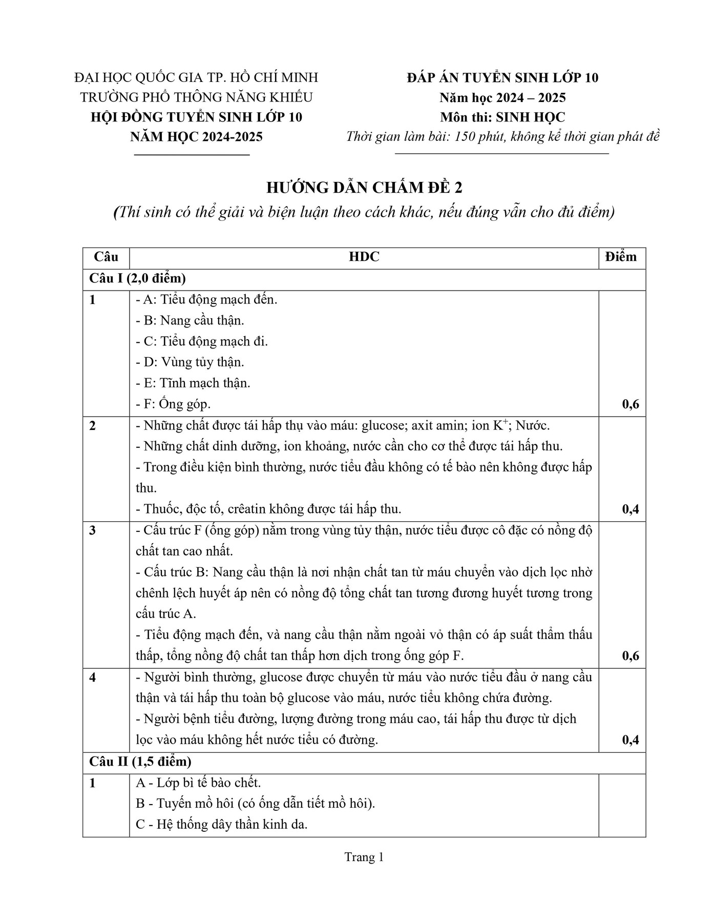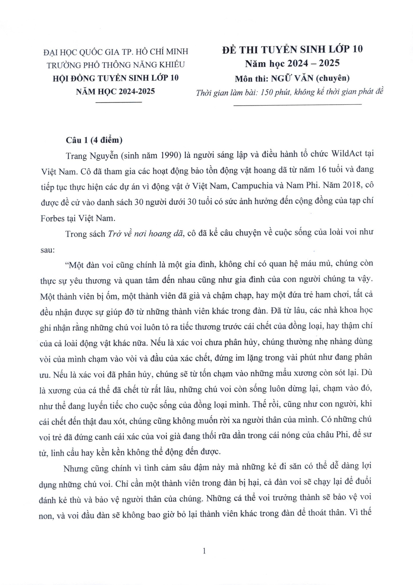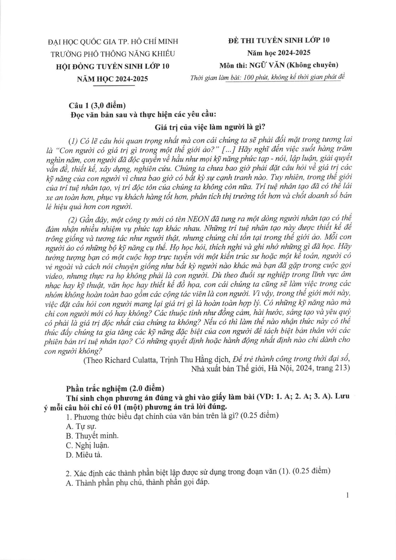 Hội đồng tuyển sinh lớp 10 của trường Phổ thông Năng khiếu (ĐHQG TP.HCM) đã công bố đáp án chính thức cho các môn thi của kỳ thi tuyển sinh vào lớp 10, năm học 2024 - 2025. 7 môn thi bao gồm: Toán (chuyên và không chuyên), Ngữ Văn (chuyên và không chuyên), Tiếng Anh (chuyên và không chuyên), Vật Lí, Hóa Học, Sinh Học và Tin Học.