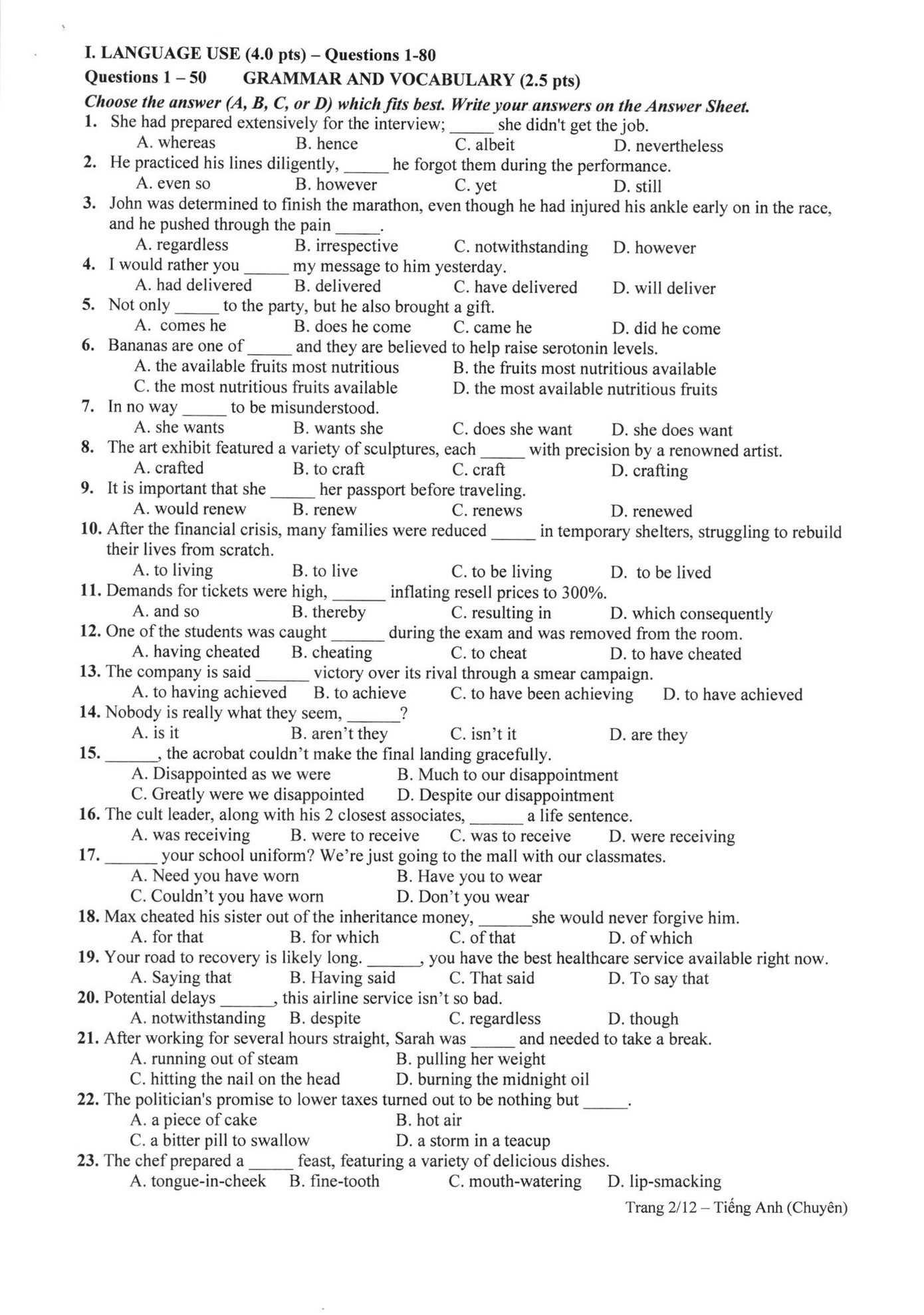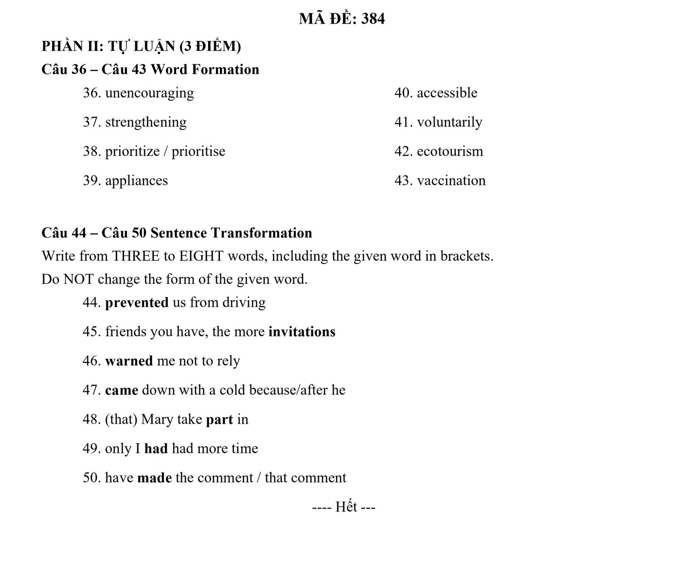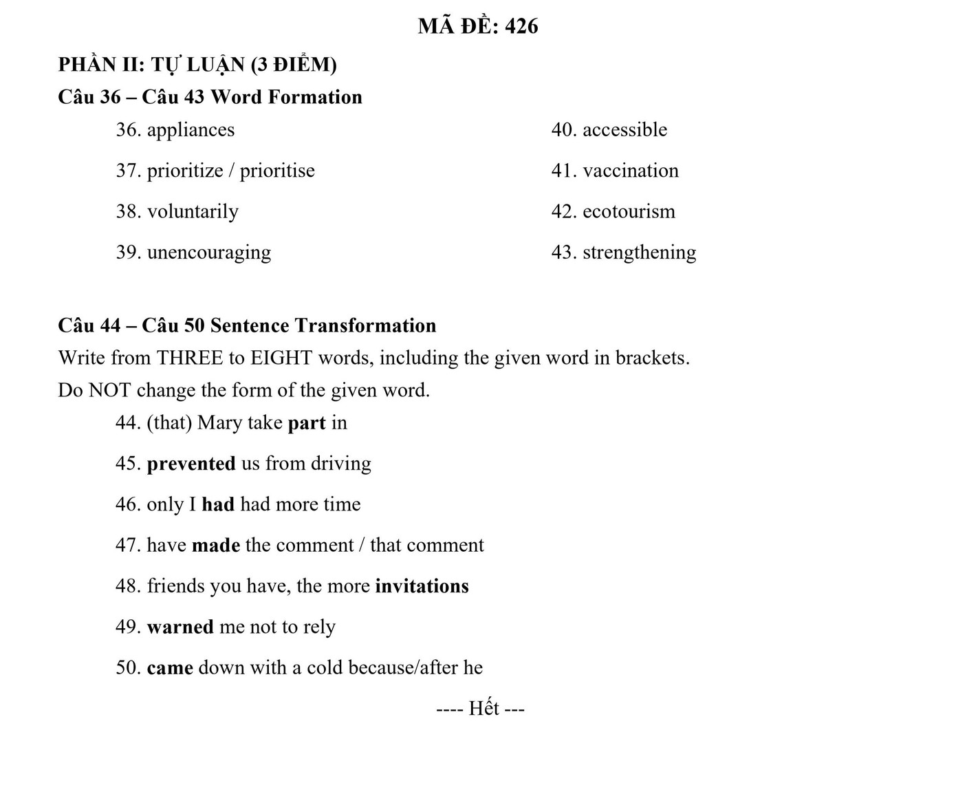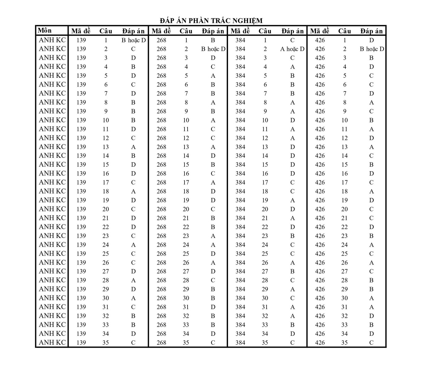 - Không phân biệt viết in hoa hay thường, nếu đúng chính tả và đúng yêu cầu đề thi (số lượng từ, ký hiệu đáp án, v.v...) thì đều tính điểm.