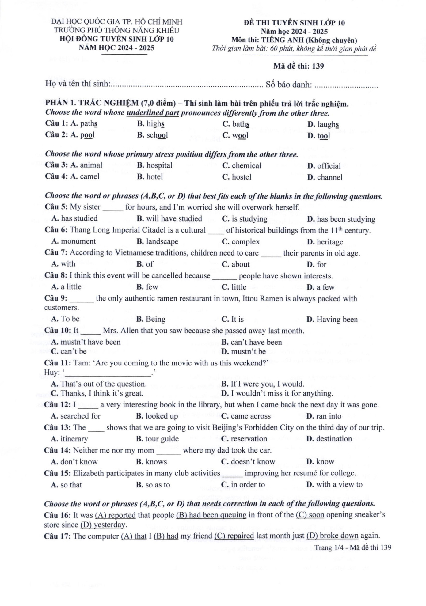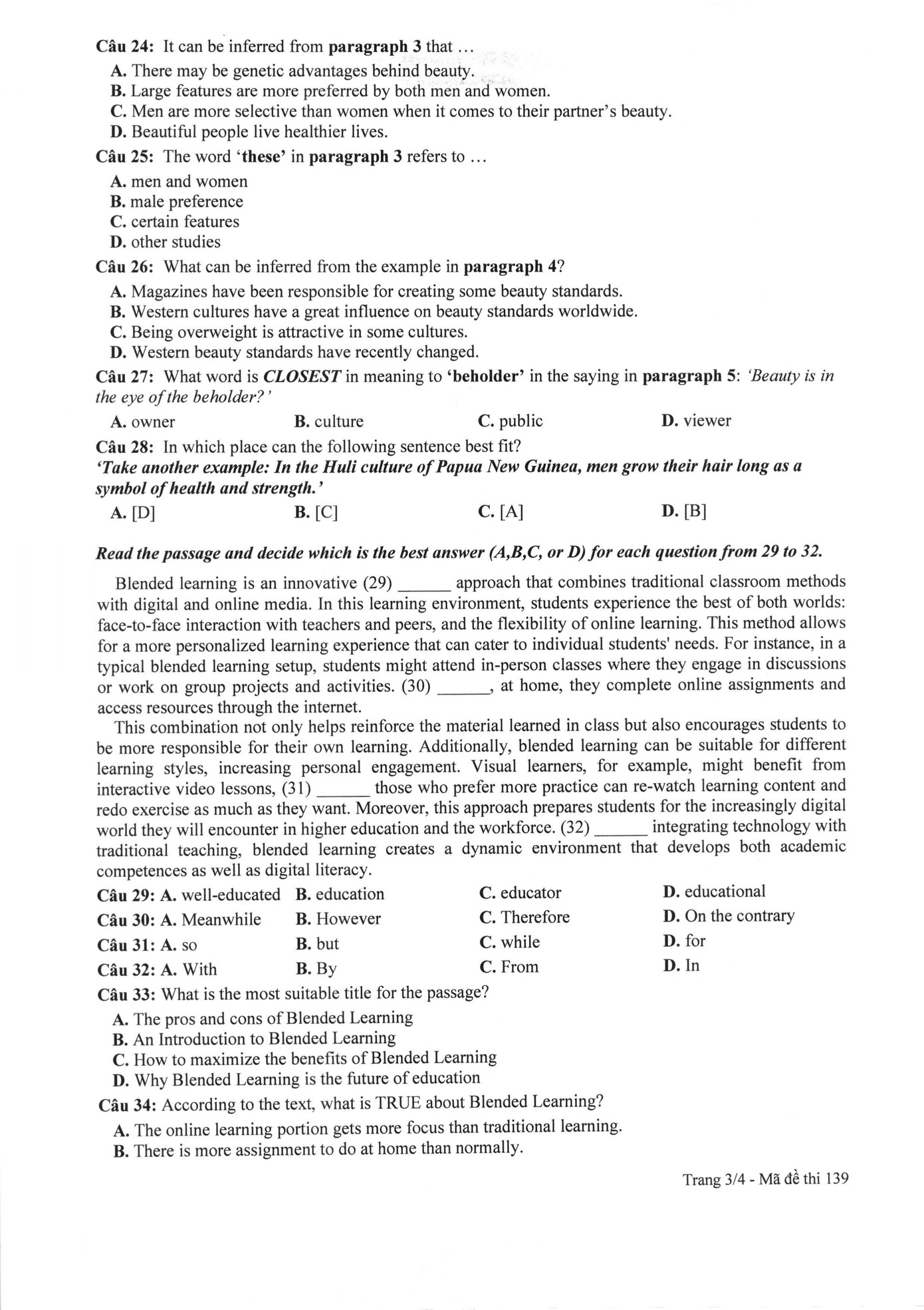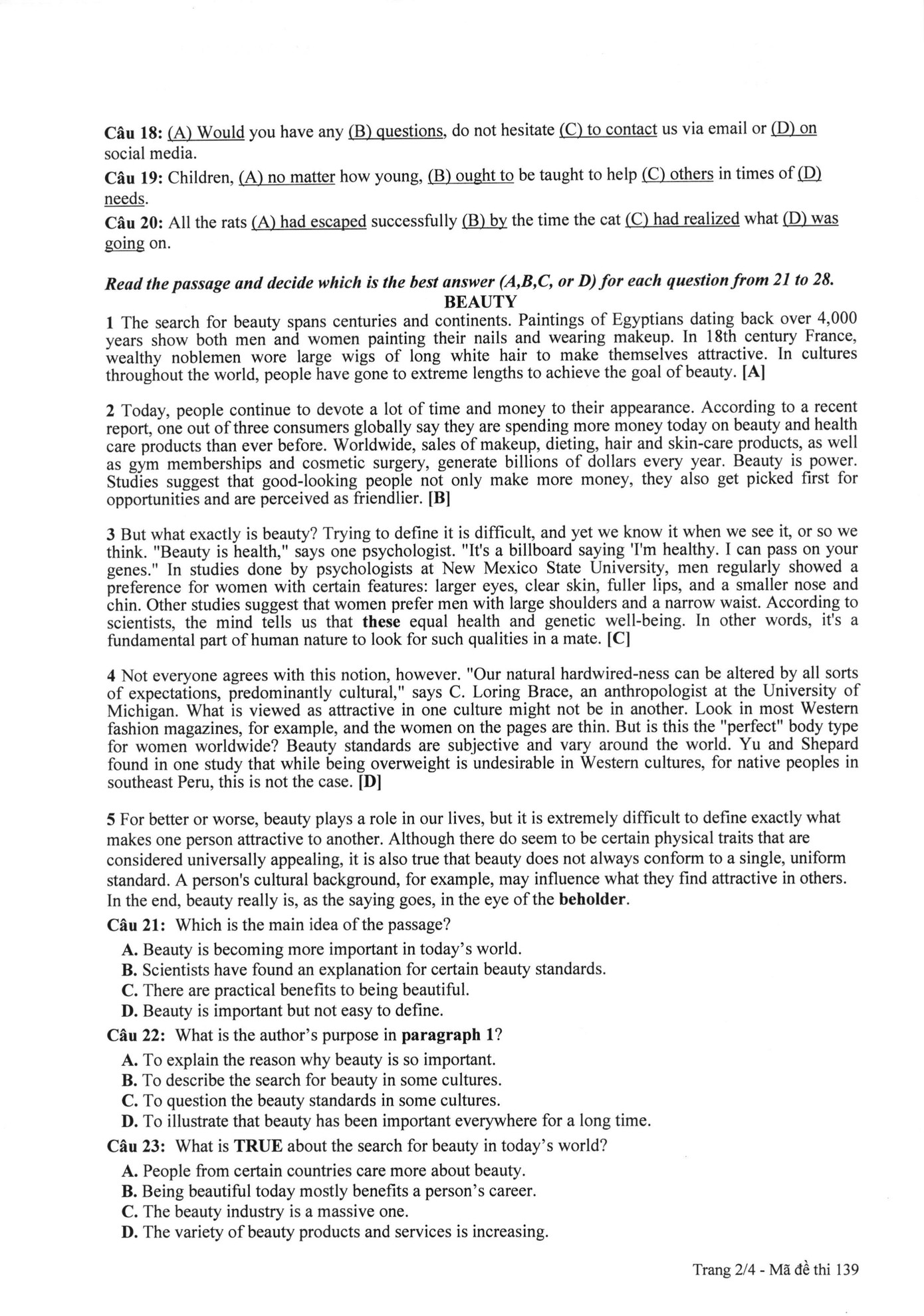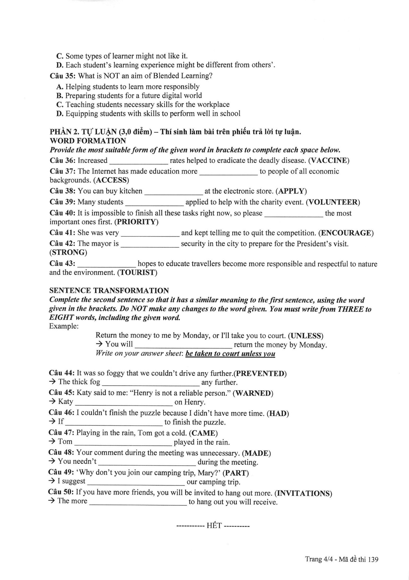 Đề thi môn Tiếng Anh (không chuyên) mã đề 139