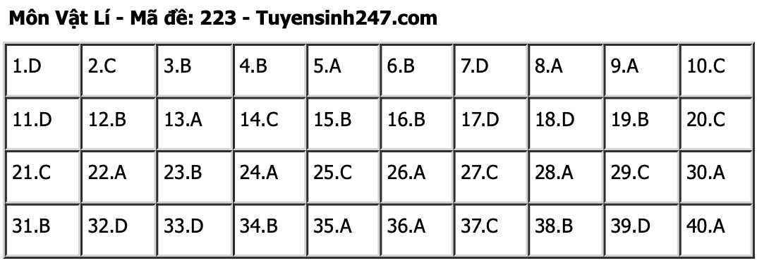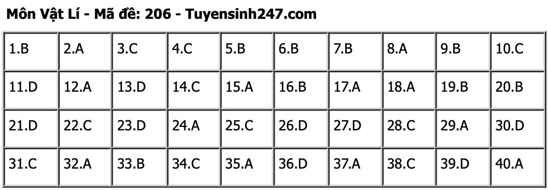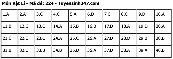 Đề thi môn Vật lí được giữ ổn định về cấu trúc nội dung như đề thi chính thức năm 2023 và tương đồng với đề thi Tham khảo tốt nghiệp THPT mà Bộ GD&ĐT đã công bố ngày 22/3/2024. Đề gồm 45% (18 câu) số câu hỏi trong đề là bài tập tính toán, 55% (22 câu) số câu hỏi lí thuyết. Các câu hỏi khó của đề thi vẫn rơi vào các chuyên đề quen thuộc trong chương trình Vật lí 12 là: Dao động cơ, Sóng cơ và sóng âm, Điện xoay chiều và Sóng ánh sáng.