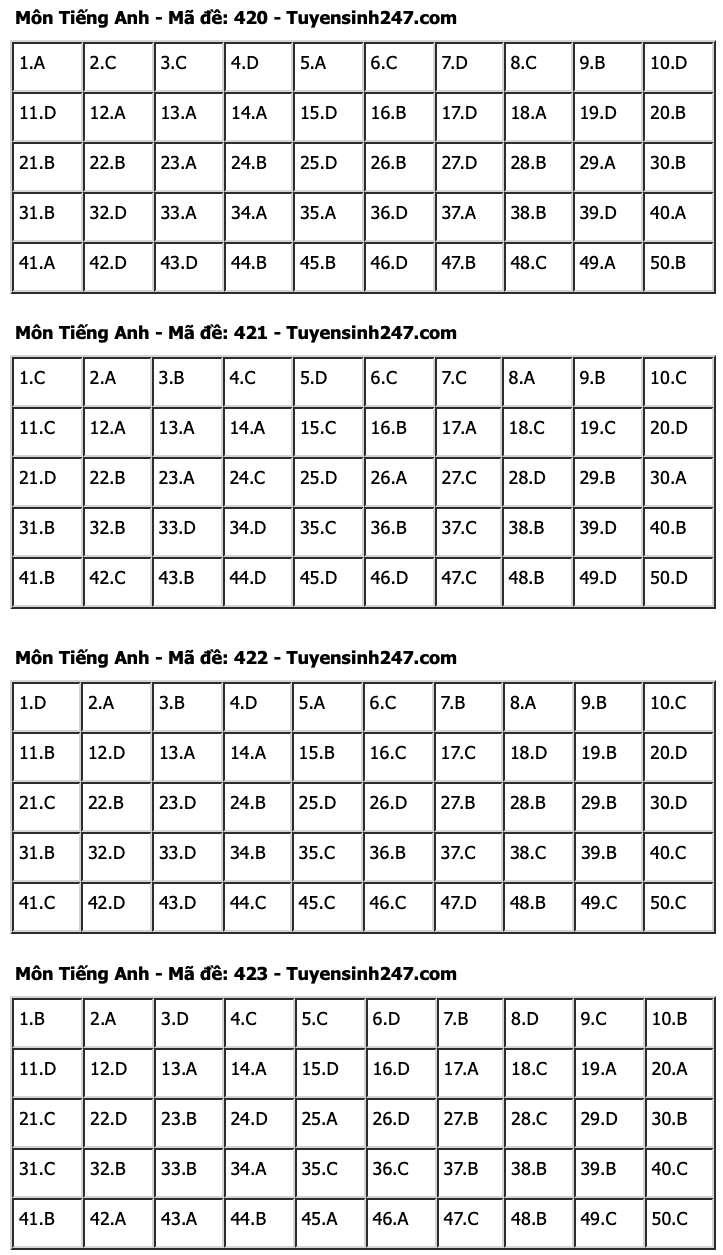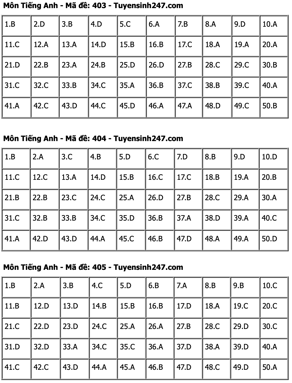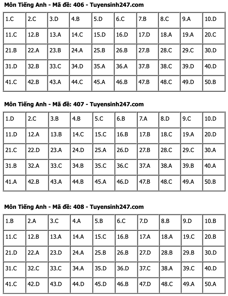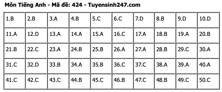 Dưới đây là đáp án tham khảo tất cả 24 mã đề môn tiếng Anh do tuyensinh247.com thực hiện.