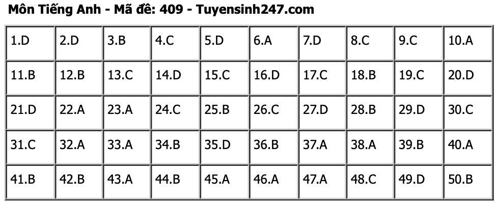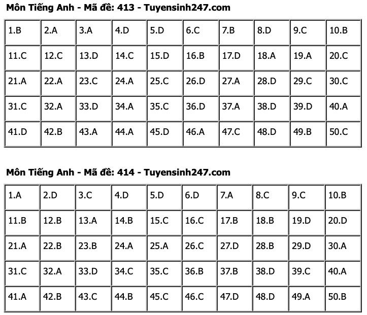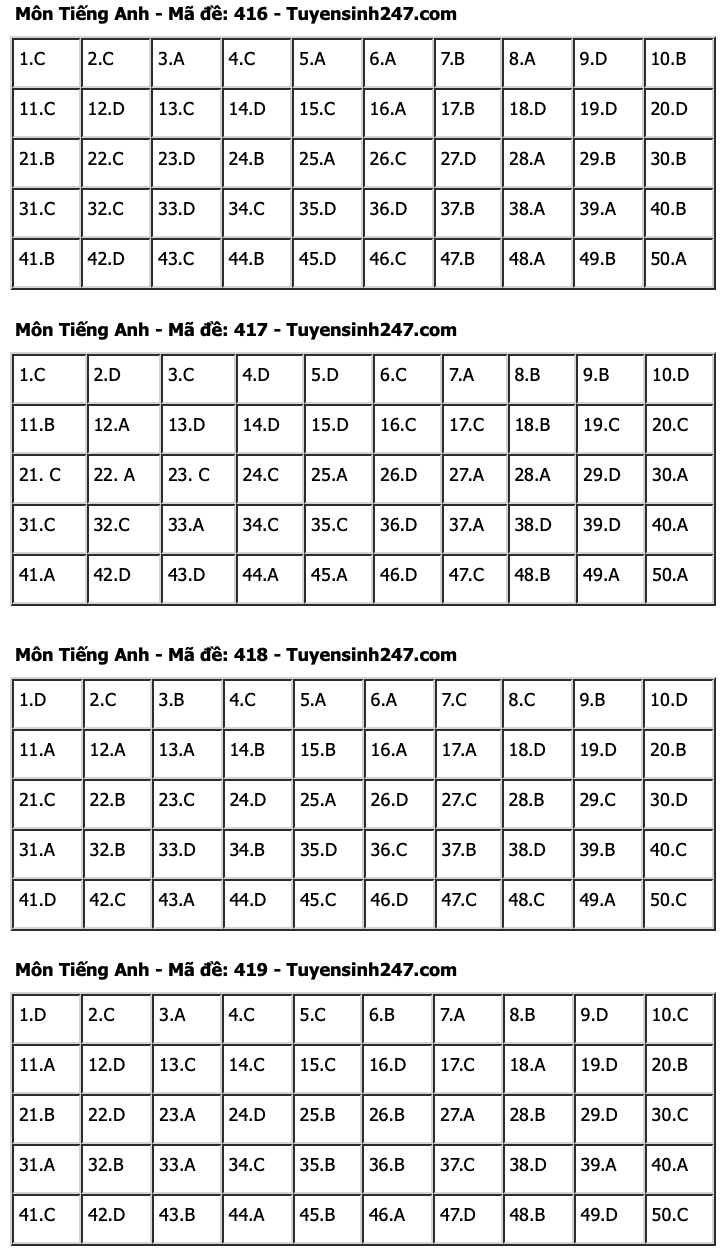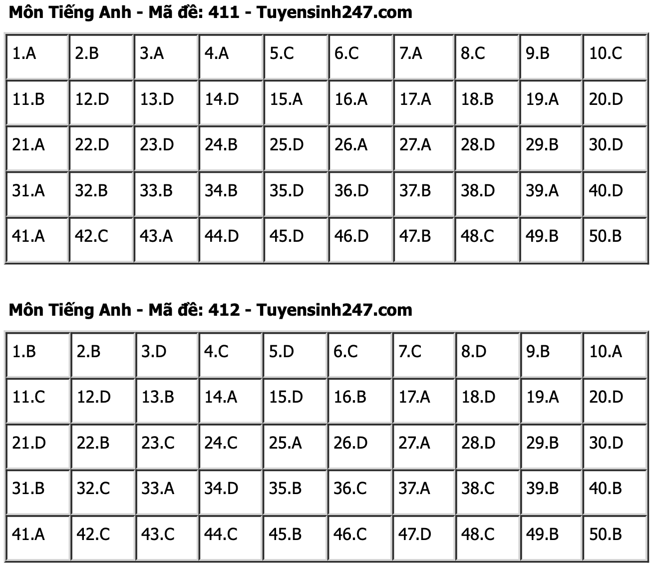 Dưới đây là đáp án tham khảo tất cả 24 mã đề môn tiếng Anh do tuyensinh247.com thực hiện.