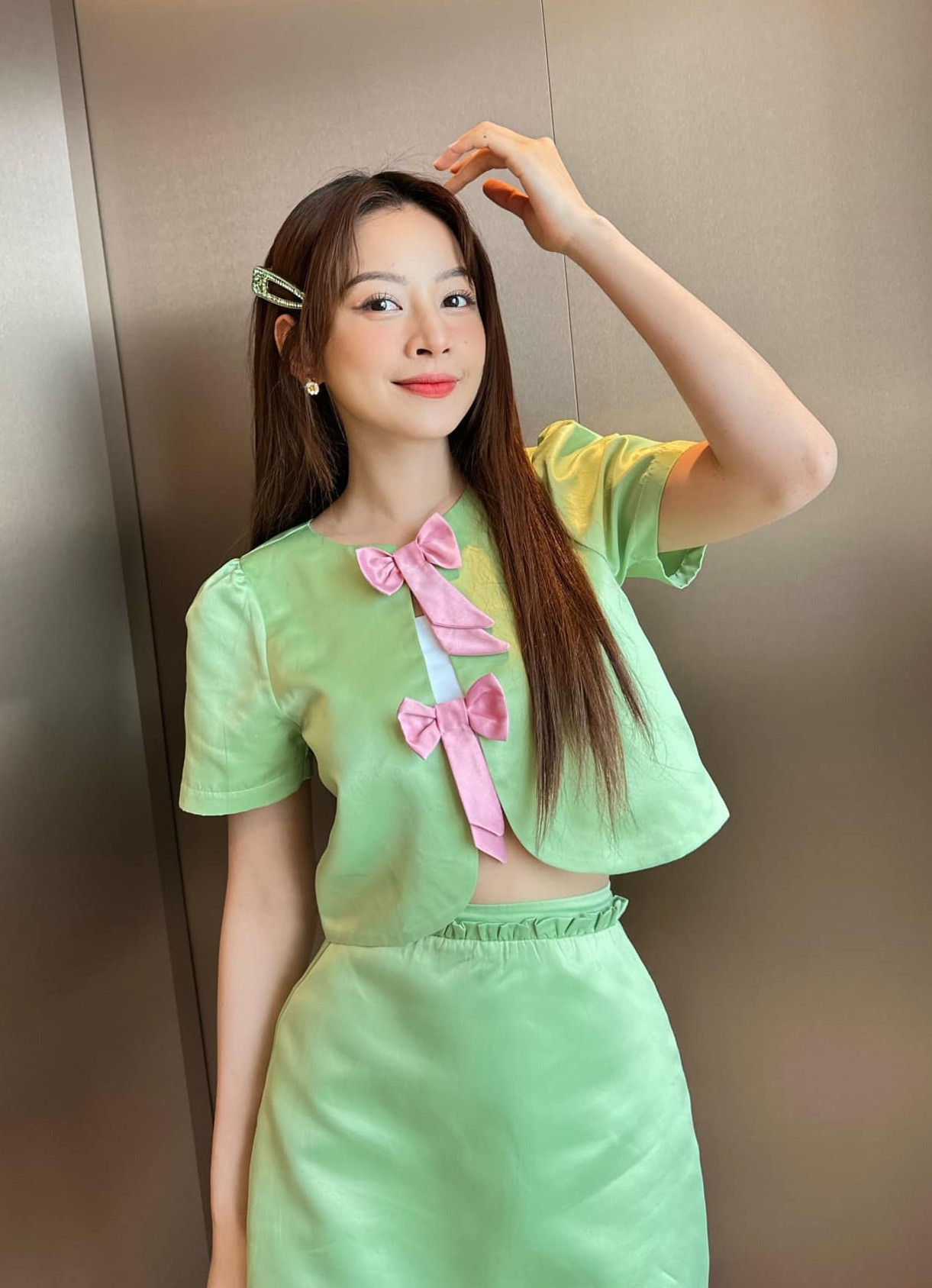 Và khi Hoàng Ku trở lại và ra tay, Chi Pu đã nhanh chóng lấy lại diện mạo đỉnh cao. Cũng là set đồ gồm áo lửng và chân váy nhưng bộ váy xanh lá này nhìn đầy ngọt ngào, thêm mái tóc dài điểm xuyết chiếc cặp tóc đồng màu váy càng giúp Chi Pu nhìn xinh như búp bê.