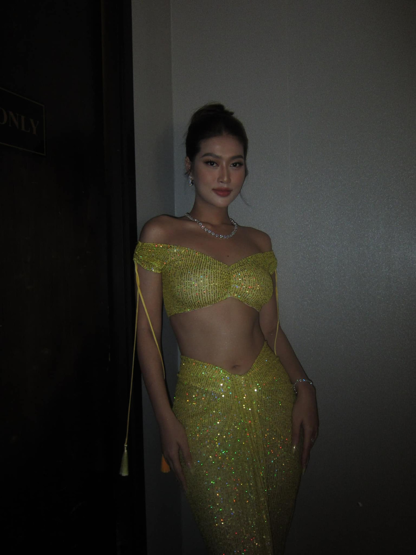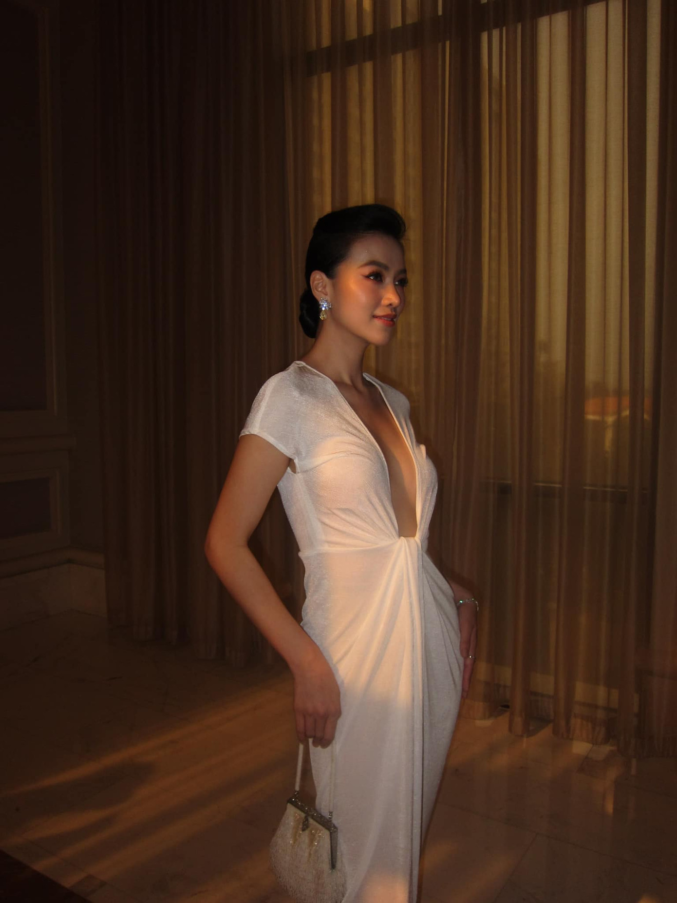 Hoa hậu Thiên Ân dưới ống kính của Lương Thùy Linh rất xinh đẹp, dịu dàng dù chụp ở nơi thiếu sáng.