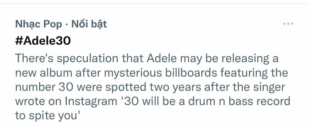 Cách đây ít ngày, hashtag Adele30 cũng đã xuất hiện trên top thịnh hành của mạng xã hội Twitter sau khi các nhà đài lớn tại Mỹ đồng loạt thả "hint" về nữ ca sĩ.