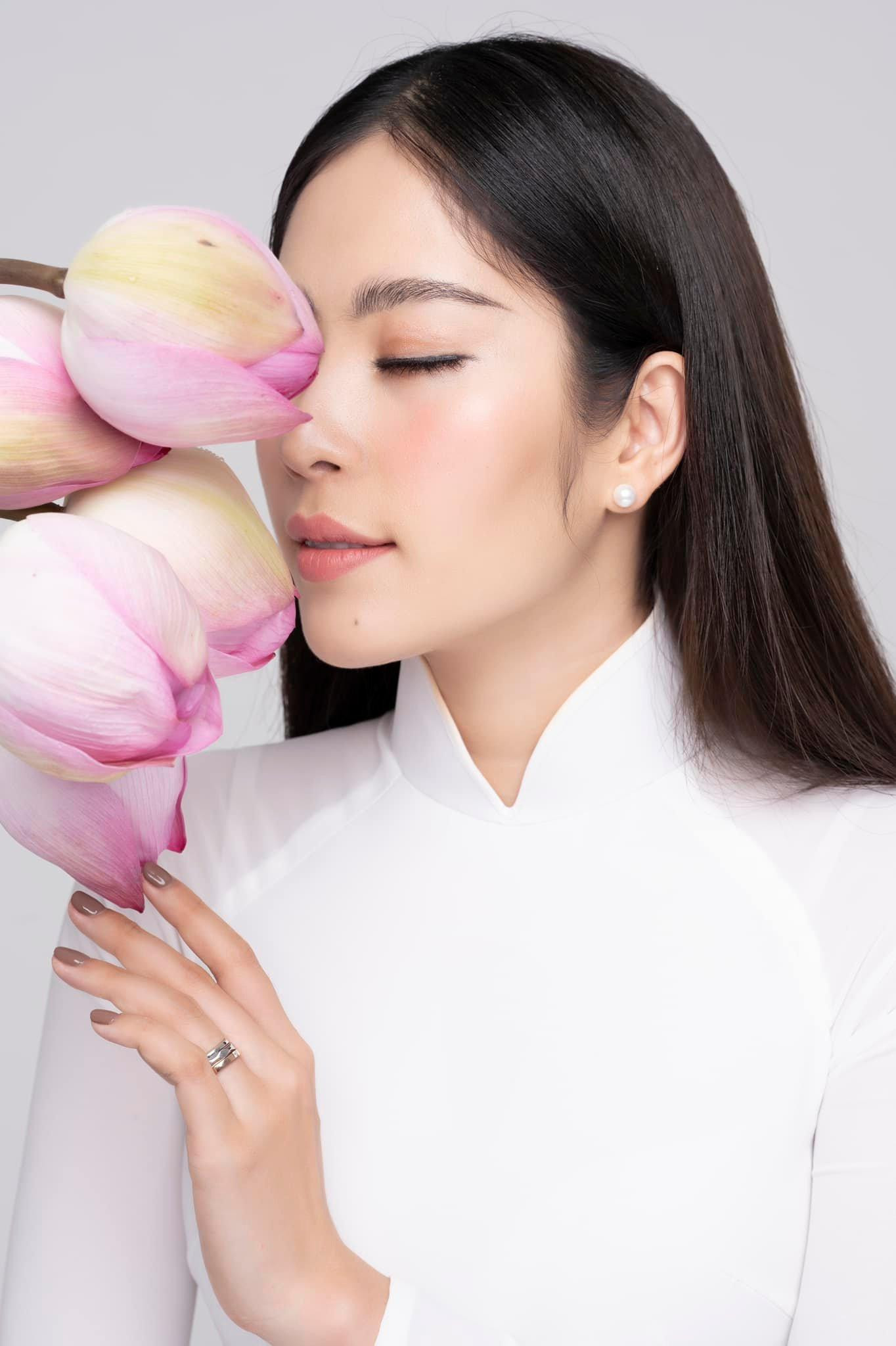 Còn nhớ trước khi cuộc thi Hoa hậu Thế giới Việt Nam 2022 khởi động, Nam Em cũng tung ra bộ ảnh mặc áo dài tinh khôi. Cô tiếp tục để tóc xõa, ôm theo một bó sen hồng.
