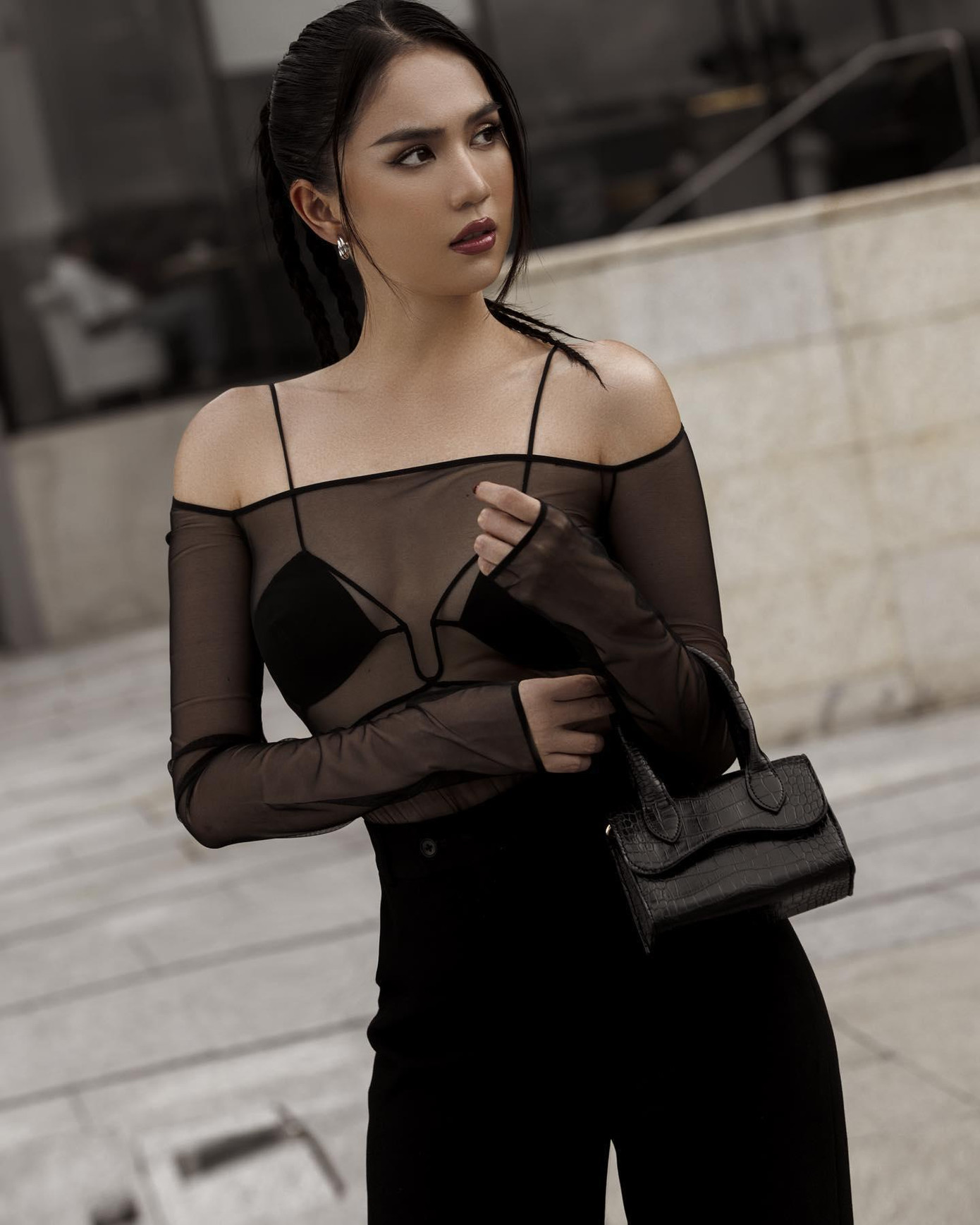 Chẳng hạn như mẫu áo voan mỏng manh đi kèm nội y đen được cho là hợp để chụp ảnh quảng cáo đồ lót hơn là trang phục mặc ra đường, như Ngọc Trinh đang làm. Nhìn từ góc chính diện hay góc nghiêng, 'nữ hoàng nội y' cũng để lộ phần lớn vòng 1 hờ hững.