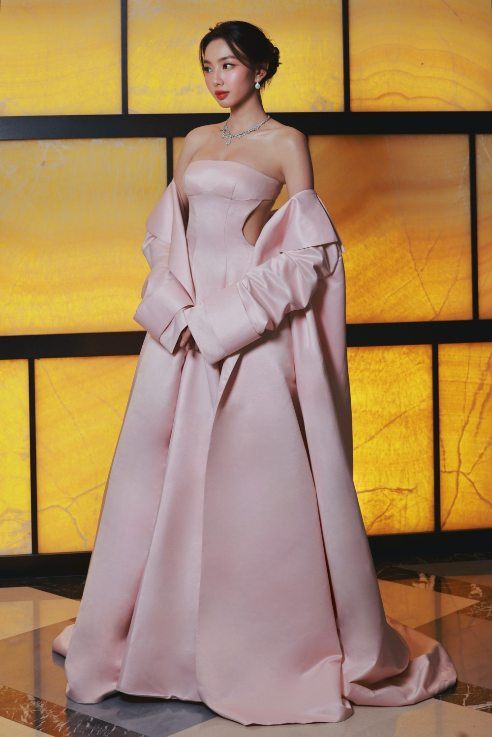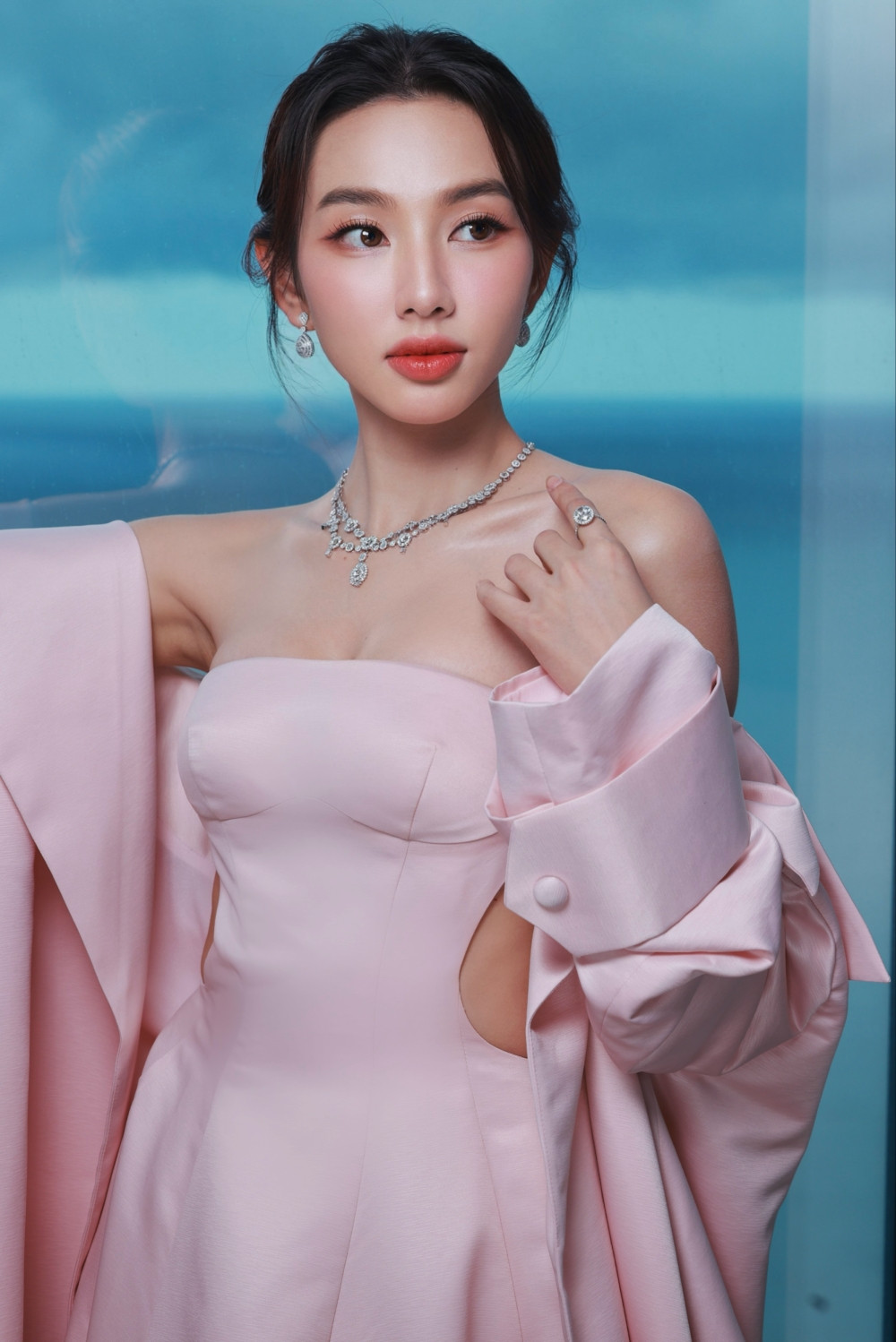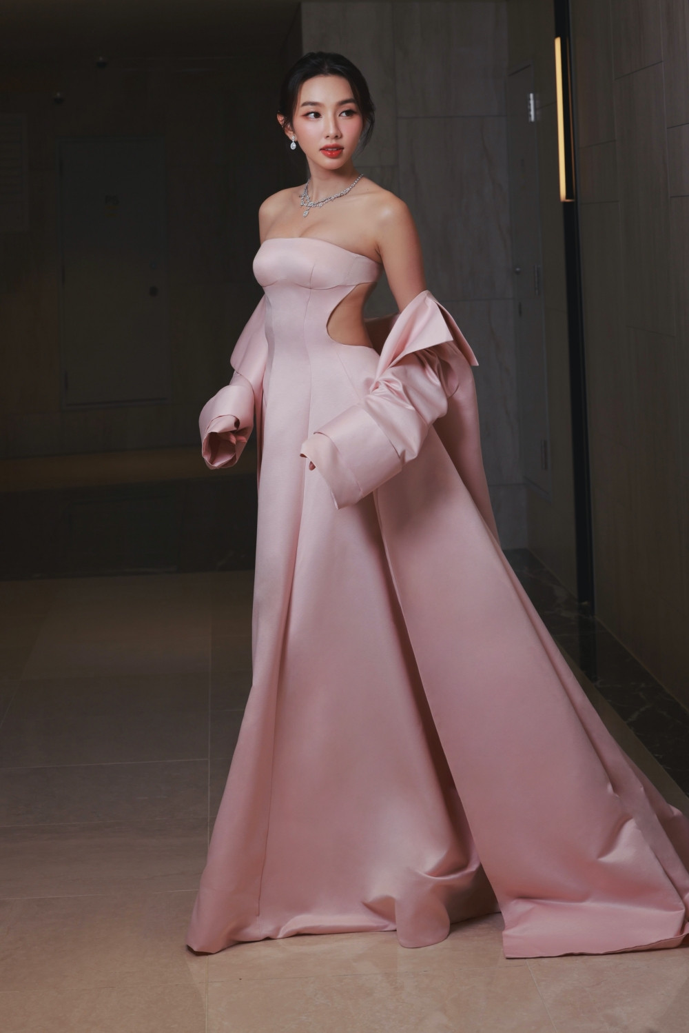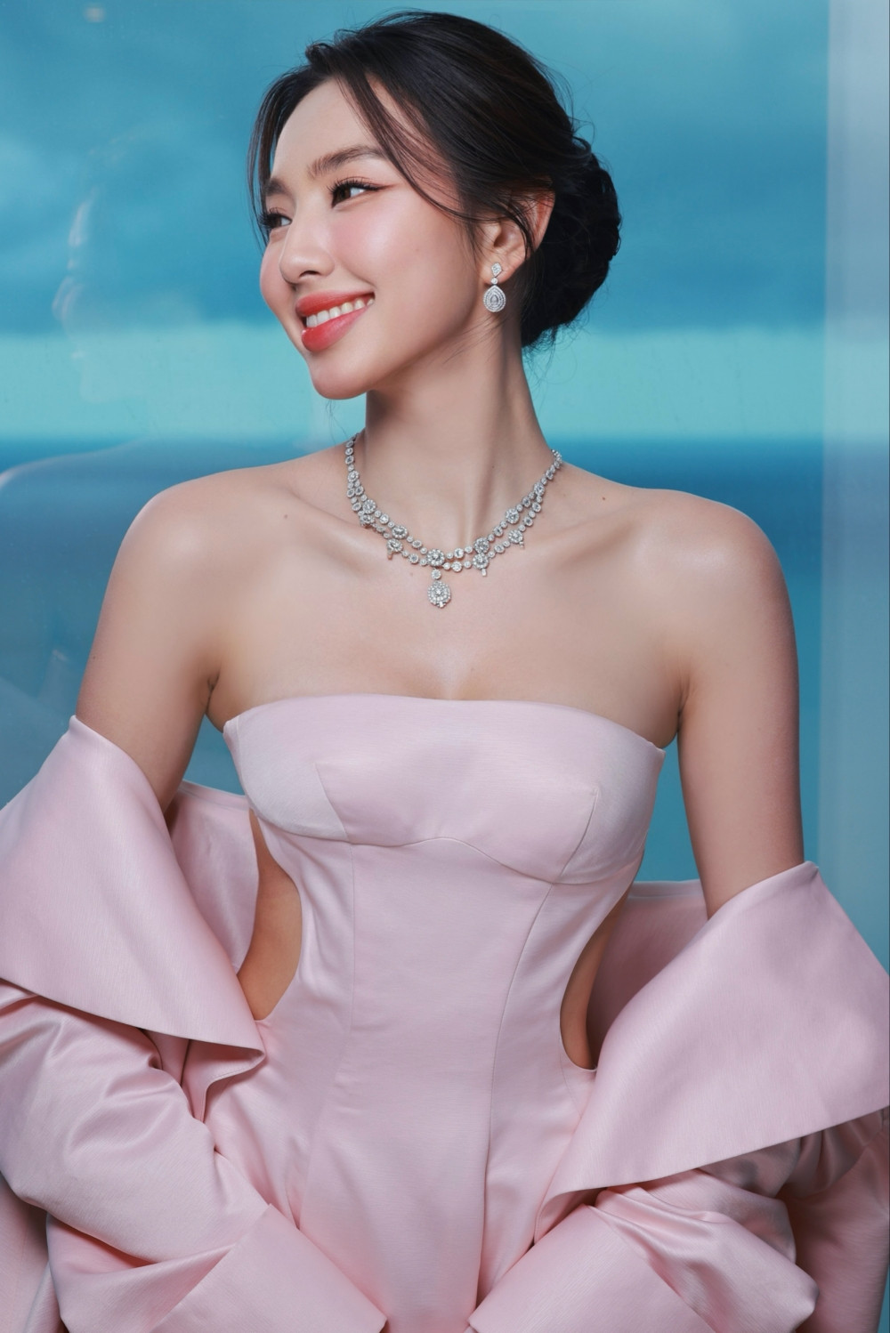 Nàng hậu khoe nhan sắc ngọt ngào, trong trẻo không thua kém các diễn viên điện ảnh Hàn. Cùng với tone trang điểm trẻ trung là chiếc đầm màu hồng cut-out, nhưng vẫn thanh lịch và sang trọng.
