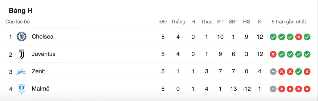 Đòi nợ hoàn hảo, Chelsea không chỉ đoạt vé đi tiếp mà còn vươn lên dẫn đầu bảng H. Chelsea và Juventus có cùng 12 điểm sau 5 lượt trận nhưng đội bóng của Tuchel xếp trên nhờ hơn thành tích đối đầu. Ở lượt trận hạ màn, các nhà ĐKVĐ chỉ cần đánh bại Zenit để chắc chắn về đích với ngôi đầu bảng H.