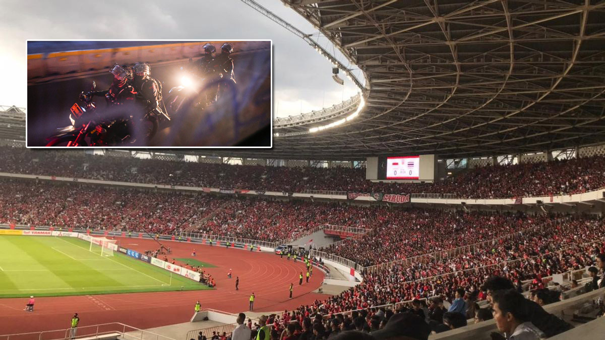 | Lực lượng cảnh sát hộ tống xe chở ĐT Thái Lan rời sân Bung Karno |