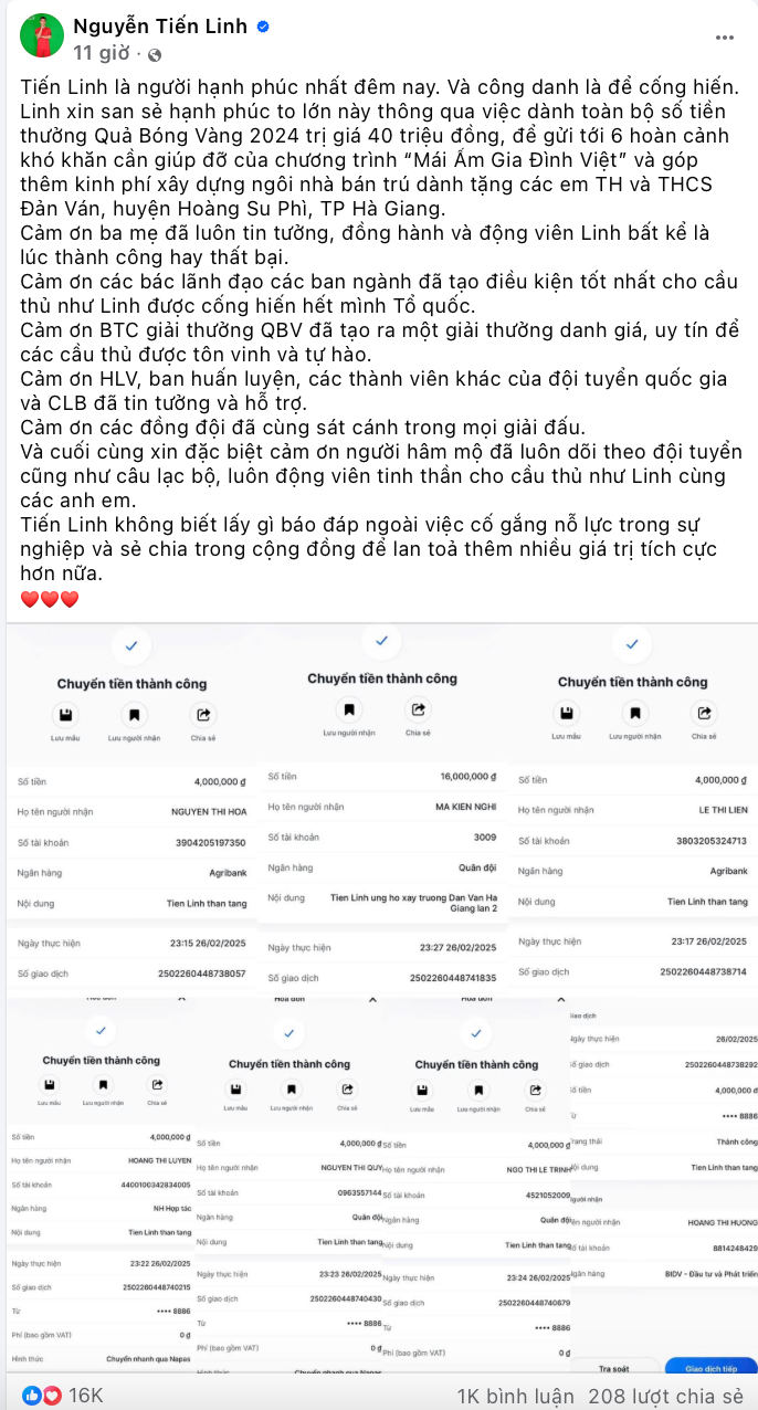 Trên trang cá nhân, Tiến Linh viết: "Tiến Linh là người hạnh phúc nhất đêm nay. Và công danh là để cống hiến. Linh xin san sẻ hạnh phúc to lớn này thông qua việc dành toàn bộ số tiền thưởng Quả bóng Vàng 2024 trị giá 40 triệu đồng, để gửi tới 6 hoàn cảnh khó khăn cần giúp đỡ của chương trình "Mái Ấm Gia Đình Việt" và góp thêm kinh phí xây dựng ngôi nhà bán trú dành tặng các em TH và THCS Đản Ván, huyện Hoàng Su Phì, TP Hà Giang".