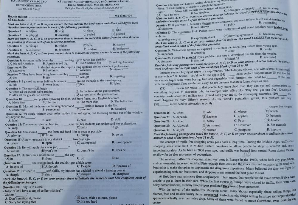 Dưới đây là đề thi môn tiếng Anh - mã đề 404: