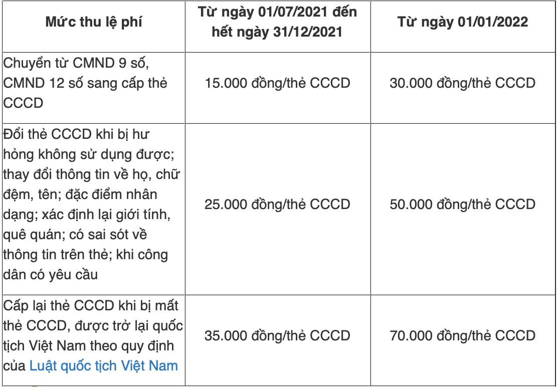 Theo đó, kể từ ngày 1/7/2021 đến hết ngày 31/12/2021, mức thu lệ phí cấp Căn cước công dân bằng 50% mức thu lệ phí quy định tại Điều 4 Thông tư 59/2019/TT-BTC quy định mức thu, chế độ thu, nộp và quản lý lệ phí cấp Căn cước công dân gắn chip. Cụ thể: