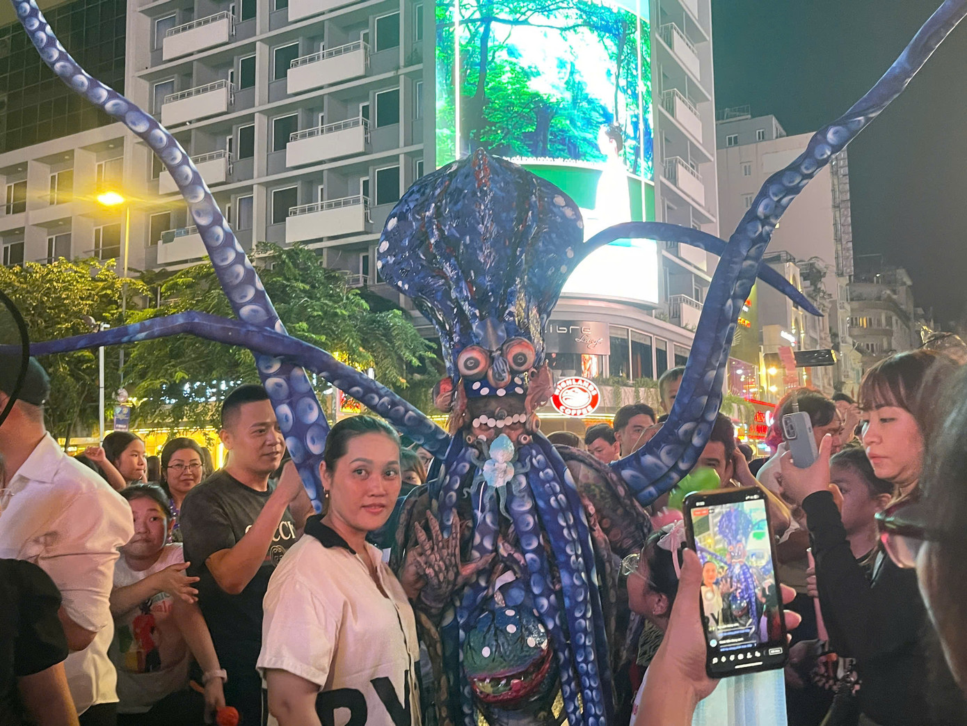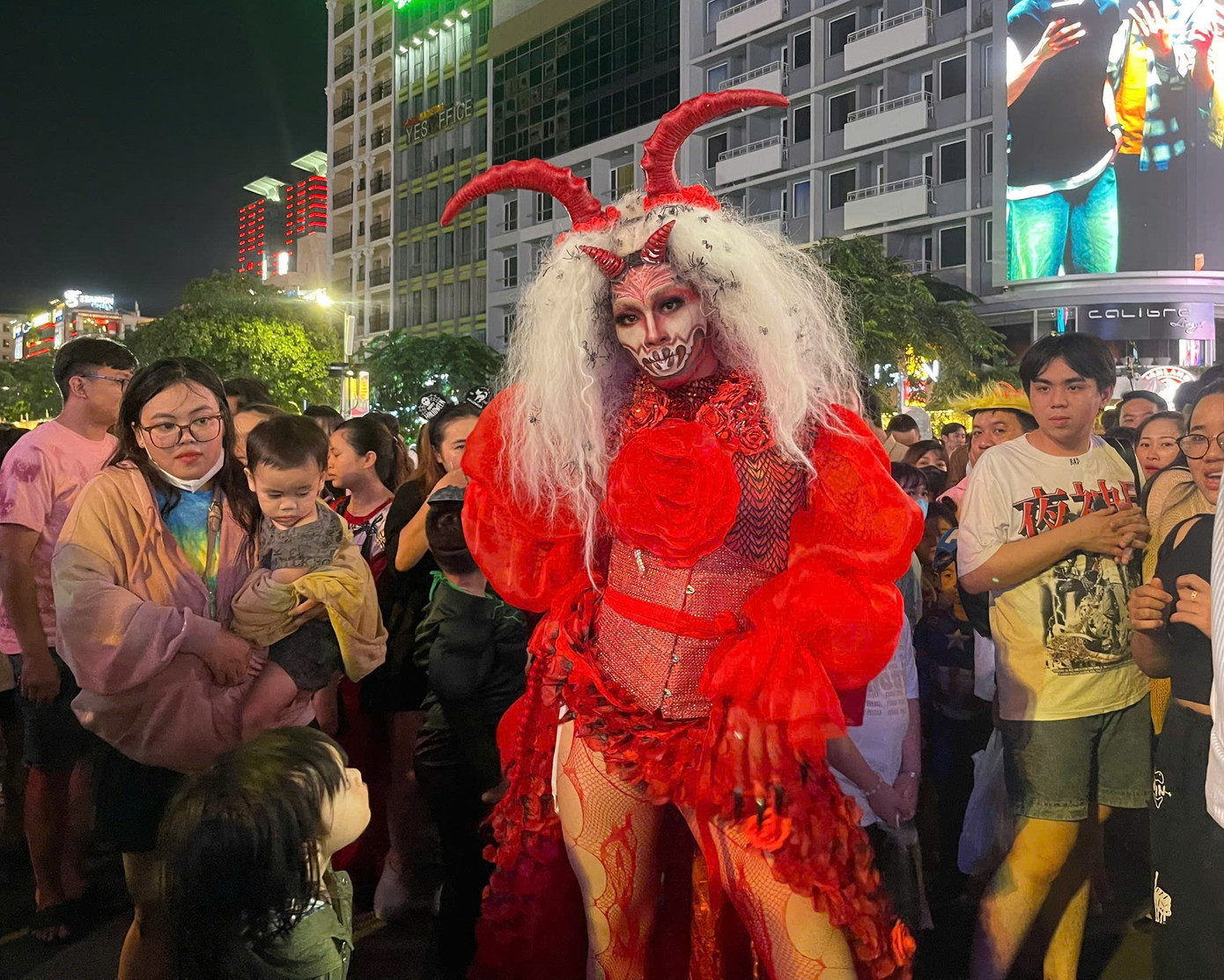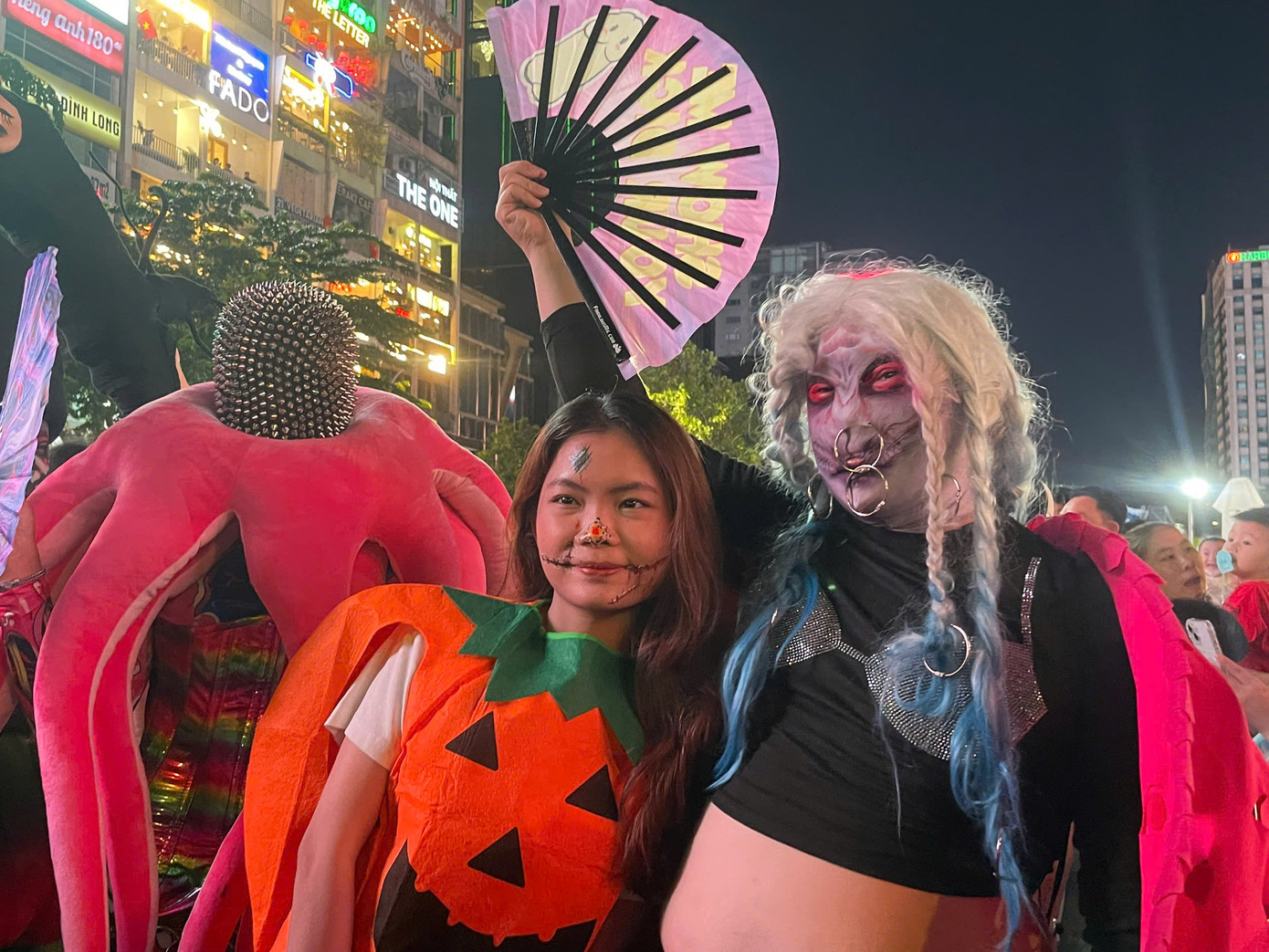 Phố đi bộ Nguyễn Huệ với không gian rộng rãi là nơi thu hút đông đảo người tham gia nhất. Từng nhóm bạn trẻ hội tụ lại, không chỉ để hoá trang mà còn để chụp ảnh, giao lưu và tận hưởng không khí sôi động.