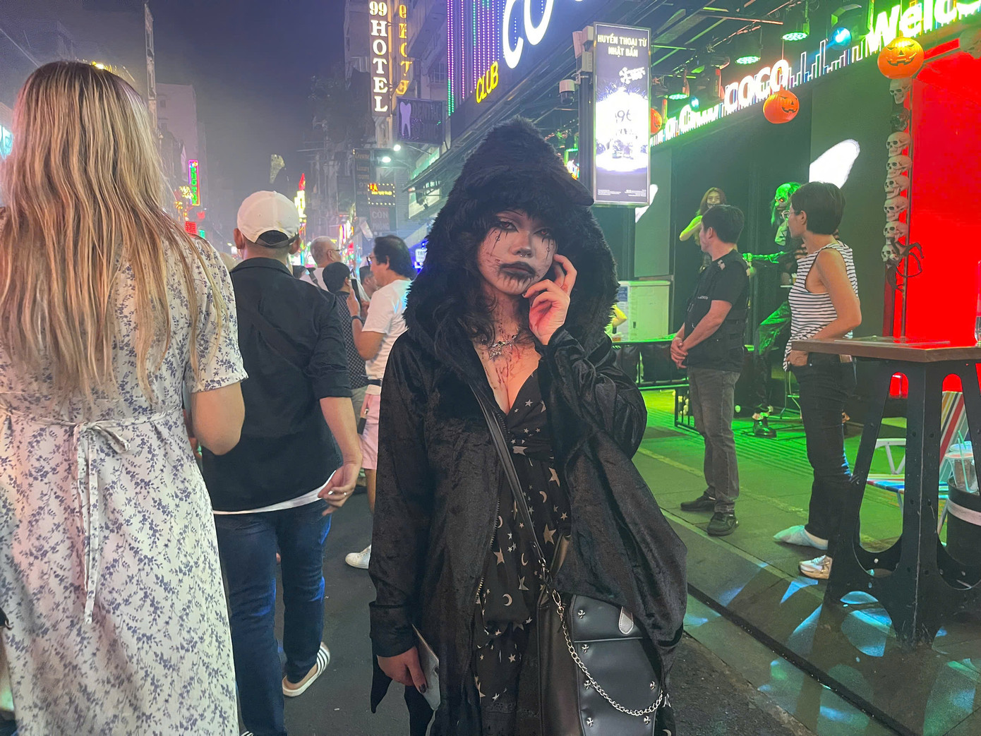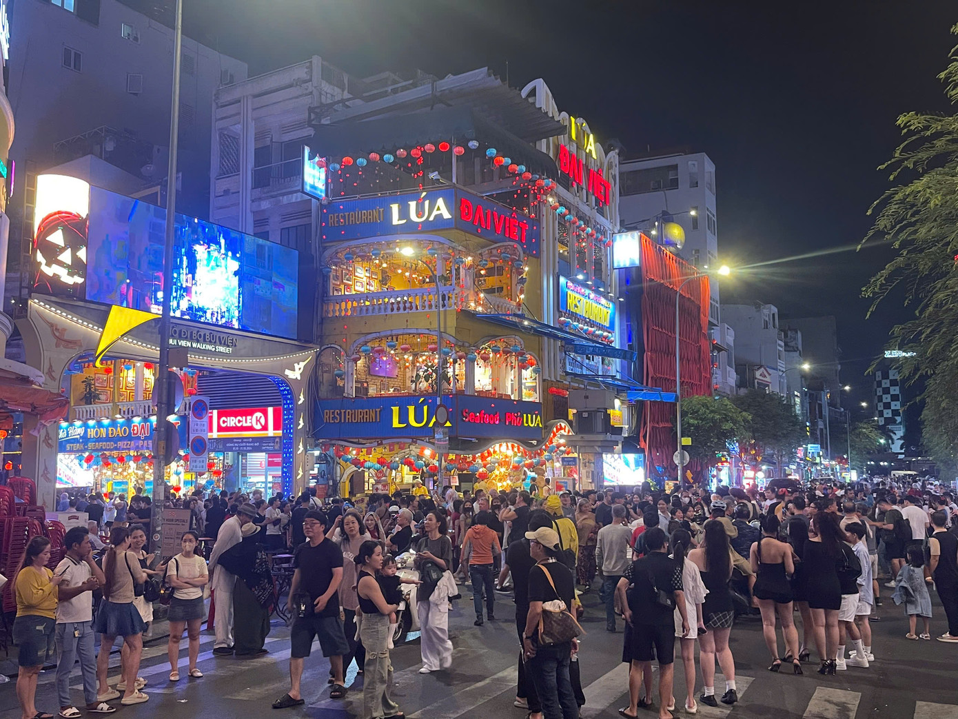 Phố đi bộ Bùi Viện cũng nhộn nhịp không kém, nổi tiếng với không gian vui chơi về đêm và phong cách hiện đại. Đêm Halloween nơi đây trở thành một sân khấu ngoài trời với các màn trình diễn đường phố, nhạc DJ sôi động và ánh sáng đèn laser đủ màu sắc. Các nhà hàng hai bên phố được trang trí công phu với những chiếc đèn bí ngô, nến, và các phụ kiện đậm chất ma quái, tạo thêm phần cuốn hút cho khách tham quan.