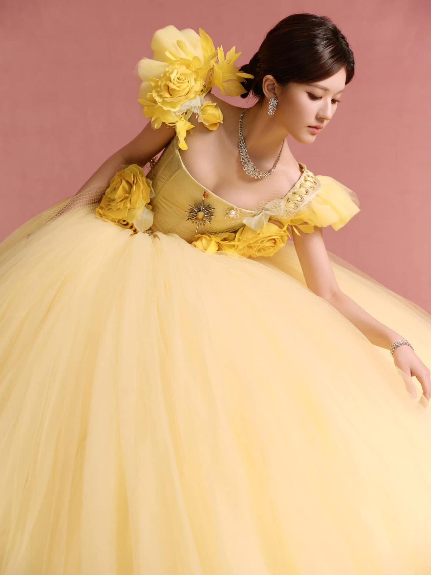 Tới tạo hình thứ 2 được phòng làm việc tung ra, Triệu Lộ Tư như hóa nàng Belle trong Người đẹp và quái vật, gây nhung nhớ với vẻ đẹp thanh tao trong chiếc đầm vàng ngọt ngào thuộc bộ sưu tập Haute Couture Thu Đông 2024 đến từ nhà mốt Julien Fournie.