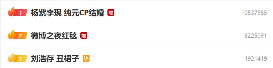 Hashtag "Dương Tử và Lý Hiện, Thuần Nguyên CP kết hôn" leo thẳng lên Top 1 bảng Hot Search, "bạo đỏ" cả mục Giải trí và bảng Chung của Weibo là minh chứng cho thấy sự phấn khích của cư dân mạng. Chưa đầy 30 phút kể từ khi "on top", hashtag này đã vượt 10 triệu lượt truy cập, bỏ xa hạng 2 là "Thảm đỏ Đêm hội Weibo" - chiếc hashtag từng trụ ở hạng 1 khoảng hơn 3 tiếng.