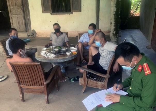 Theo đó, ngày 3/9, tổ kiểm tra công tác phòng, chống dịch COVID-19 thị xã Thái Hoà, Công an phường Quang Tiến đi kiểm tra, phát hiện tại nhà ông P.Đ.T (SN 1964, trú tại phường Quang Tiến) cùng 4 người gồm: H.V.D (SN 1992), H.V.Q (SN 1987), cùng trú tại xã Nghĩa Tiến; Đ.Q.D (SN 1966) và L.T.K (SN 1967), cùng trú tại phường Hòa Hiếu đang tụ tập ăn nhậu ở sân nhà ông P.Đ.T.
