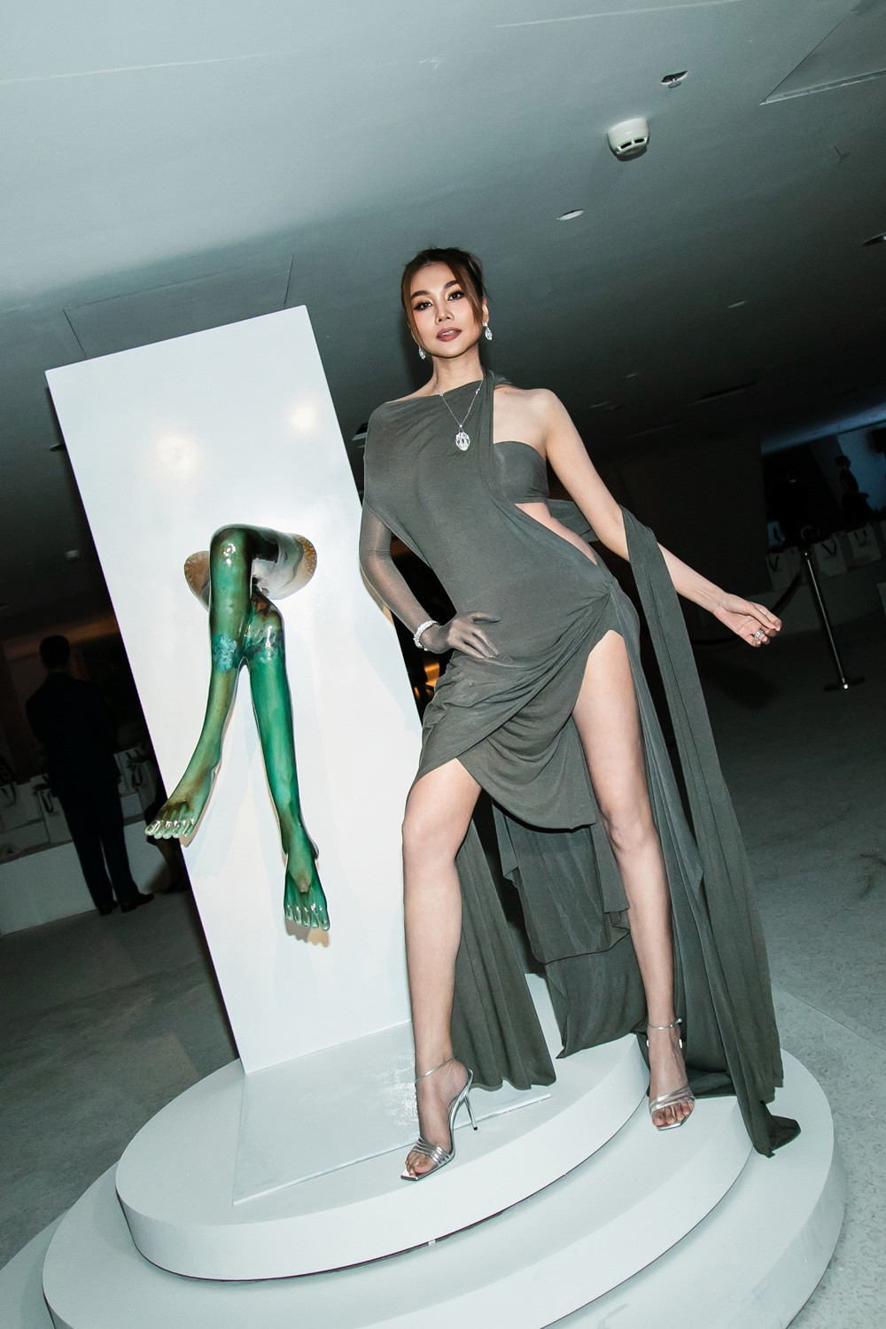 Trên thảm đỏ, Thanh Hằng thu hút mọi ống kính với vẻ quyến rũ, sang trọng và quyền lực. Người đẹp tranh thủ tạo dáng bên bức tượng mô phỏng theo đôi chân của cô.