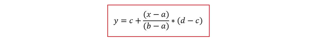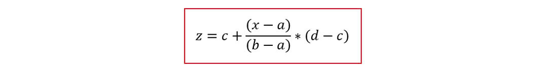 Từ Bảng phân vị tương quan với các giá trị khoảng điểm phân vị cụ thể sẽ thực hiện nội suy hàm quy đổi mức điểm chuẩn giữa các phương thức tuyển sinh khác nhau. Theo đó, từ mức điểm chuẩn x thuộc khoảng phân vị [a,b) của phương thức tuyển sinh này sẽ được nội suy tương đương sang mức điểm chuẩn y thuộc khoảng phân vị [c,d) tương ứng với phương thức tuyển sinh khác theo công thức như sau: