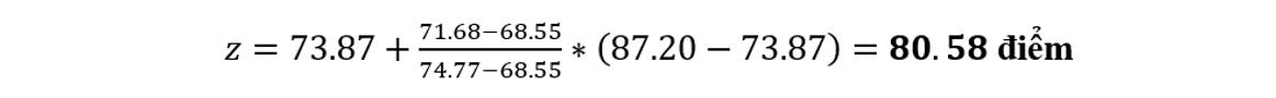 Áp dụng công thức nội suy tính điểm chuẩn tương đương đối với điểm XTTN diện 1.3 z từ điểm chuẩn ĐGTD x = 71.68 sẽ được tính như sau: