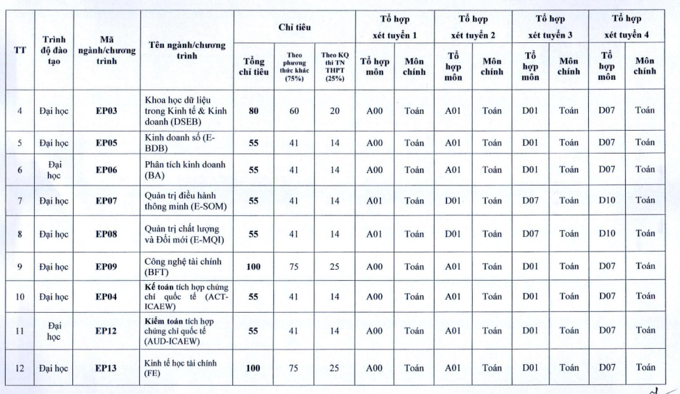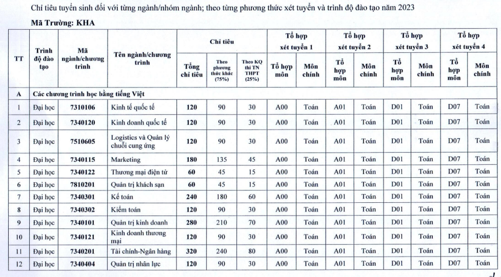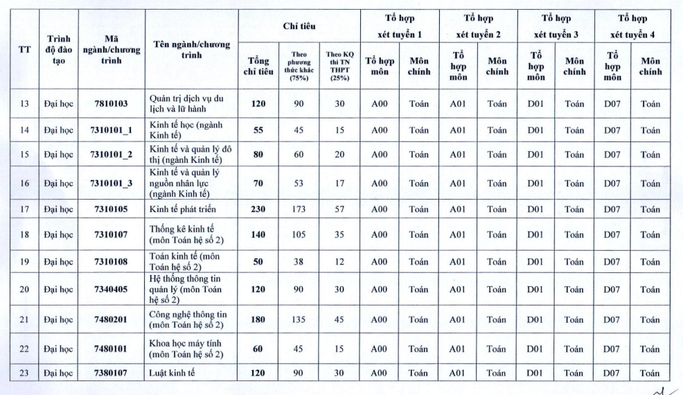 | Chi tiêu tuyển sinh chi tiết của trường ĐH Kinh tế Quốc dân năm 2023. |