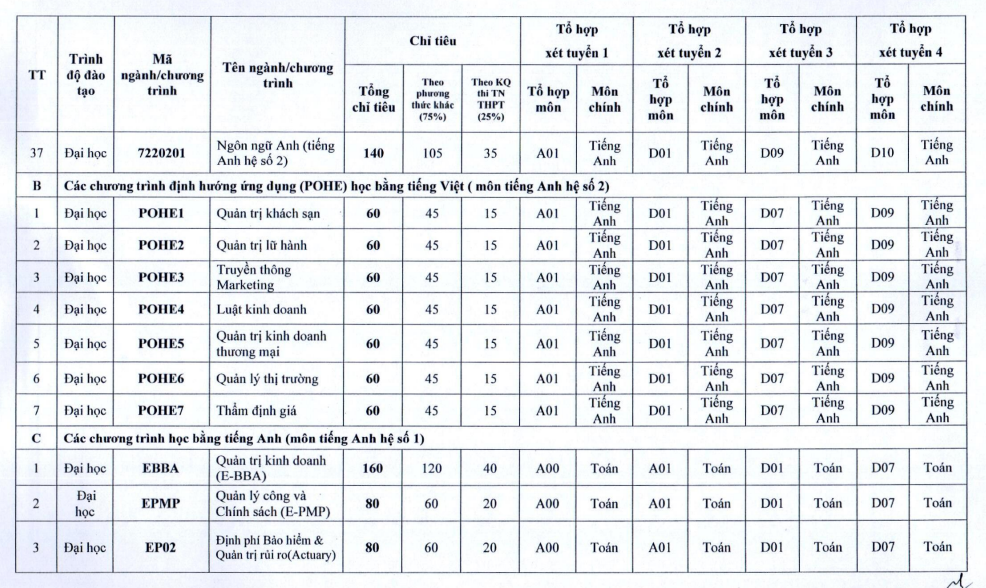 - Xét tuyển thẳng áp dụng cho các đối tượng tại mục 1.8.2 đề án này và theo thông báo chi tiết của trường.