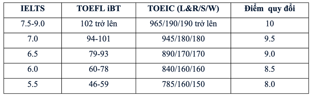 Trong đó các chứng chỉ tiếng Anh quốc tế được quy đổi điểm như sau: