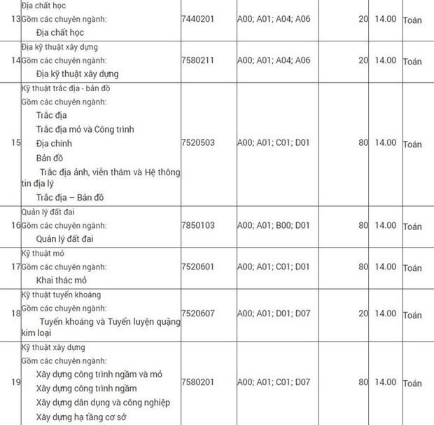 Điểm trúng tuyển Đại học Mỏ - Địa chất năm 2019 từ 14 đến 17,5, trong đó phổ biến 14-15 điểm.