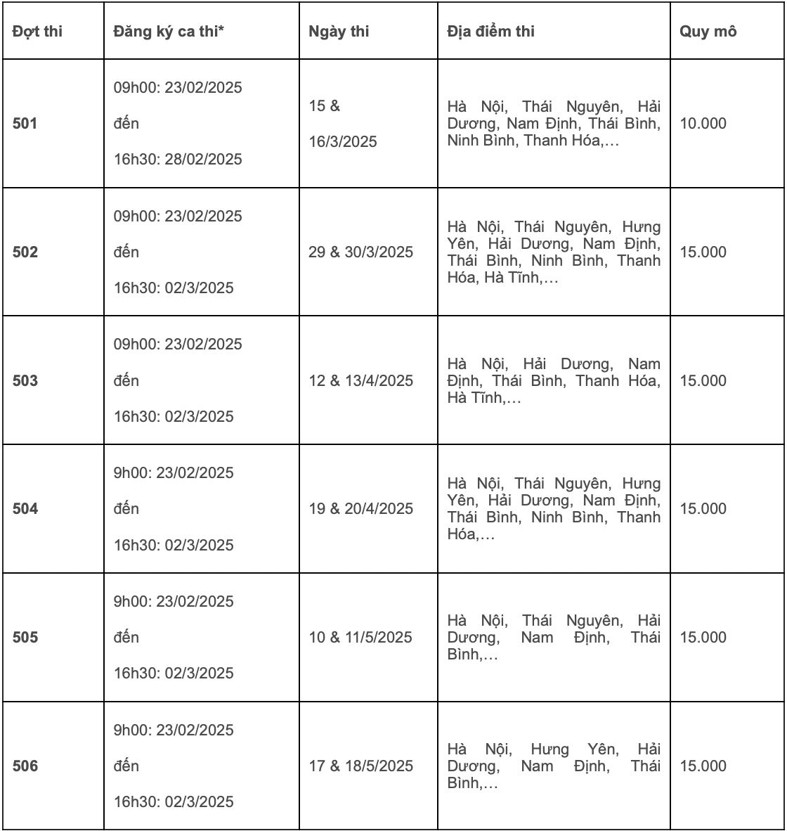Hệ thống cho phép thí sinh đăng ký tối đa 2 lượt thi/năm (tính đến ngày 31/12/2025). Hai lượt thi liên tiếp cách nhau tối thiểu 28 ngày. Ca thi sẽ tự động đóng trước 14 ngày thi chính thức.