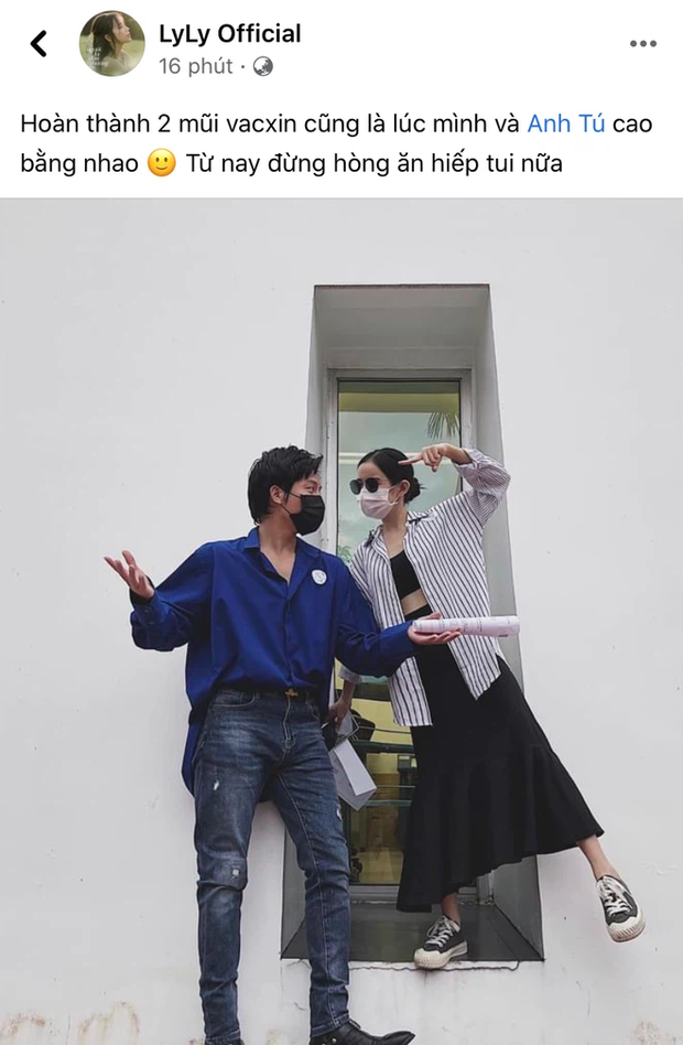 Cụ thể, Lyly đã chia sẻ bức ảnh "ăn gian" chiều cao khi đứng trên bậc thang chụp cùng Anh Tú. Chẳng những thế, giọng ca Anh Đừng Đi còn đính kèm chú thích ngọt ngào: "Hoàn thành 2 mũi vacxin cũng là lúc mình và Anh Tú cao bằng nhau. Từ nay đừng ăn hiếp tui nữa".