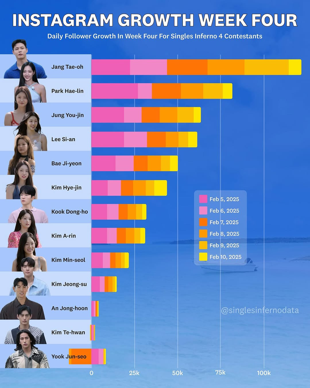 Jang Theo, Park Hae Lin và Jung You Jin lần lượt là ba người chơi xếp hạng đầu trong thống kê này. Ở tuần phát sóng thứ tư, Jang Theo hút hơn 100K lượt followers mới trên Instgram. Chỉ số này của Hae Lin là hơn 75 nghìn, You Jin là hơn 50 nghìn.