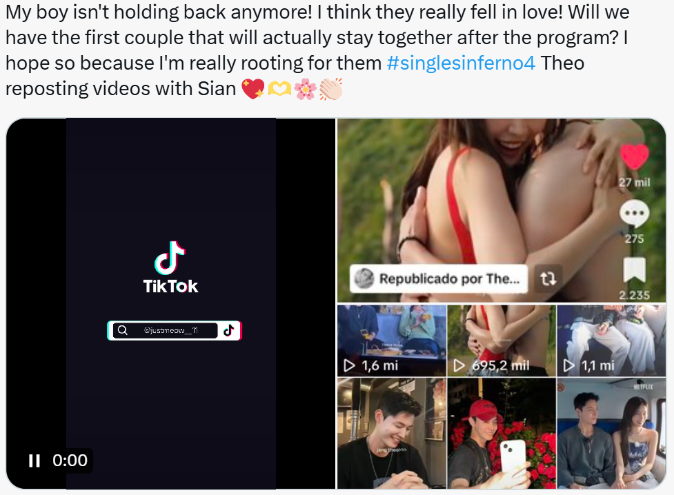 | Có 5/9 video đăng lại của Jang Theo nói về quan hệ thả thính, tình cảm giữa anh và Si An. |