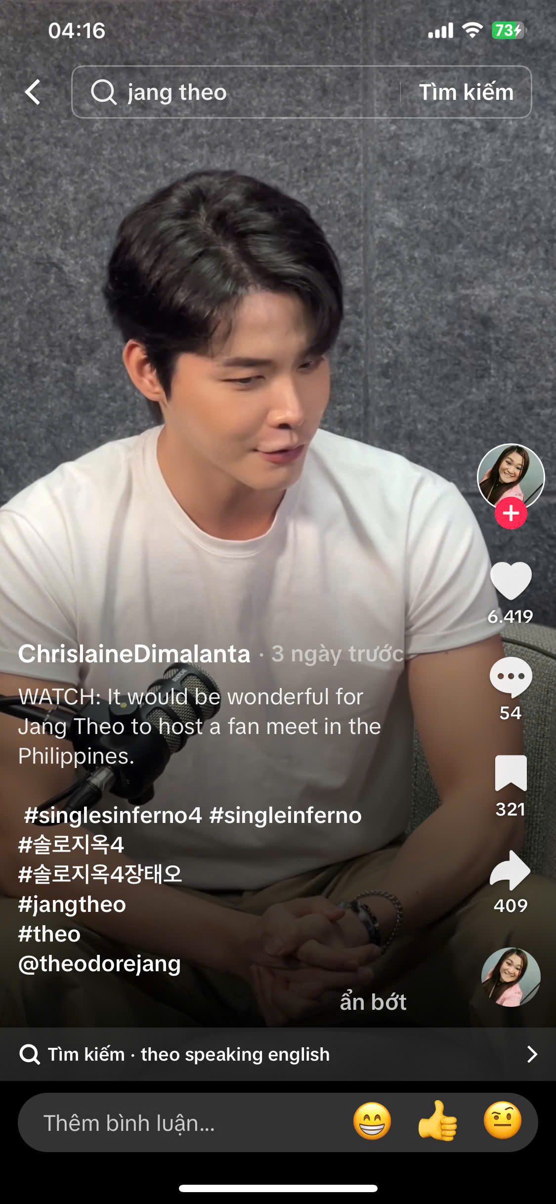 Jang Theo hiện là một trong những người chơi có cá tính độc đáo cùng hoạt động sôi nổi nhất trong 4 tập phát sóng đầu tiên của Địa Ngục Độc Thân - Single's Inferno 4. Tài khoản Instagram của mỹ nam ghi nhận mức tăng 150 nghìn lượt sau 6 ngày lên sóng.