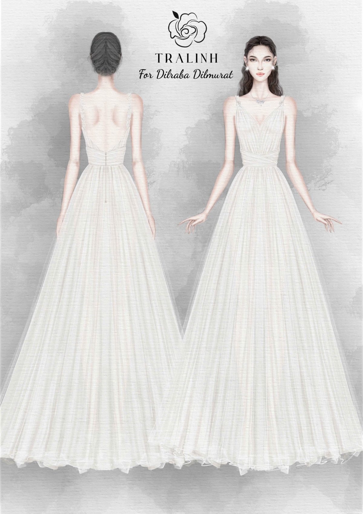 Nhà thiết kế Trà Linh cho biết vào đầu tháng 3/2025, đại diện của Địch Lệ Nhiệt Ba đã liên hệ may một bộ váy để nữ diễn viên sinh năm mặc cho buổi chụp hình. Họ yêu cầu trang phục nhẹ nhàng, tinh tế để làm nổi bật vóc dáng “mình hạc sương mai”, vẻ đẹp thanh khiết của Địch Lệ Nhiệt Ba.