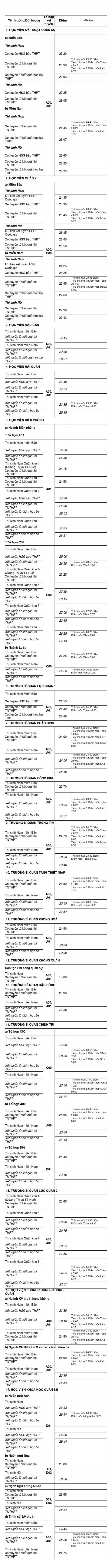 Theo đó, điểm chuẩn cao nhất là 29,44 điểm. Mức điểm này dành cho thí sinh nữ, ngành Ngôn ngữ Anh tại Học viện Khoa học Quân sự. Ngành Ngôn ngữ Nga điểm chuẩn dành cho nữ là Học viện này là 29,3 điểm. Trong khi đó, mức điểm dành cho thí sinh nam thấp hơn từ gần 3 điểm đến trên 4 điểm.