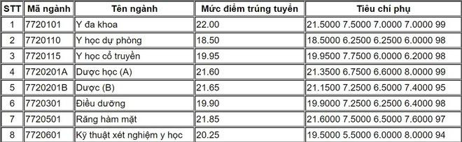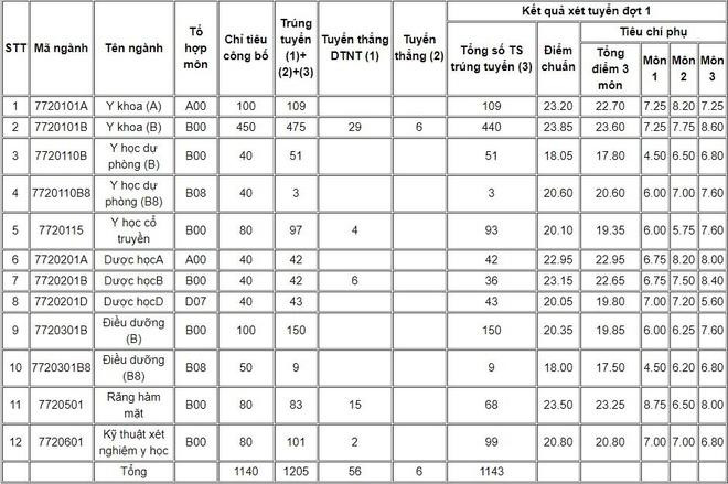 Theo đó, ngành Y khoa (tổ hợp môn B00) có điểm trúng tuyển cao nhất với 23,85, ngành Điều dưỡng có điểm chuẩn thấp nhất - 18.