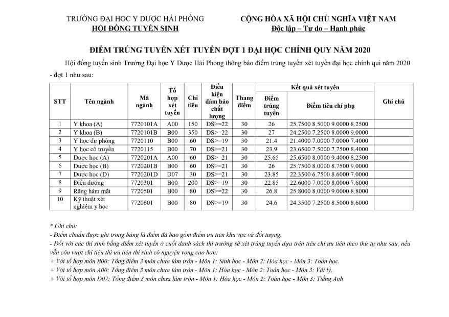 Điểm chuẩn năm 2020 của Trường Đại học Y Dược Hải Phòng, đợt 1 đại học chính quy năm 2020 cụ thể như sau: