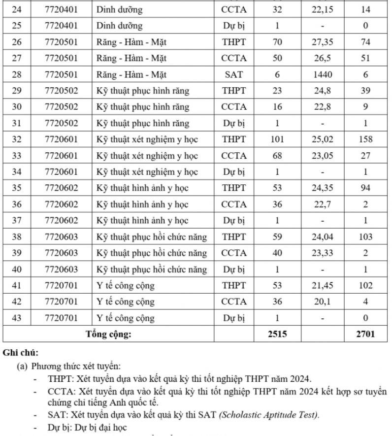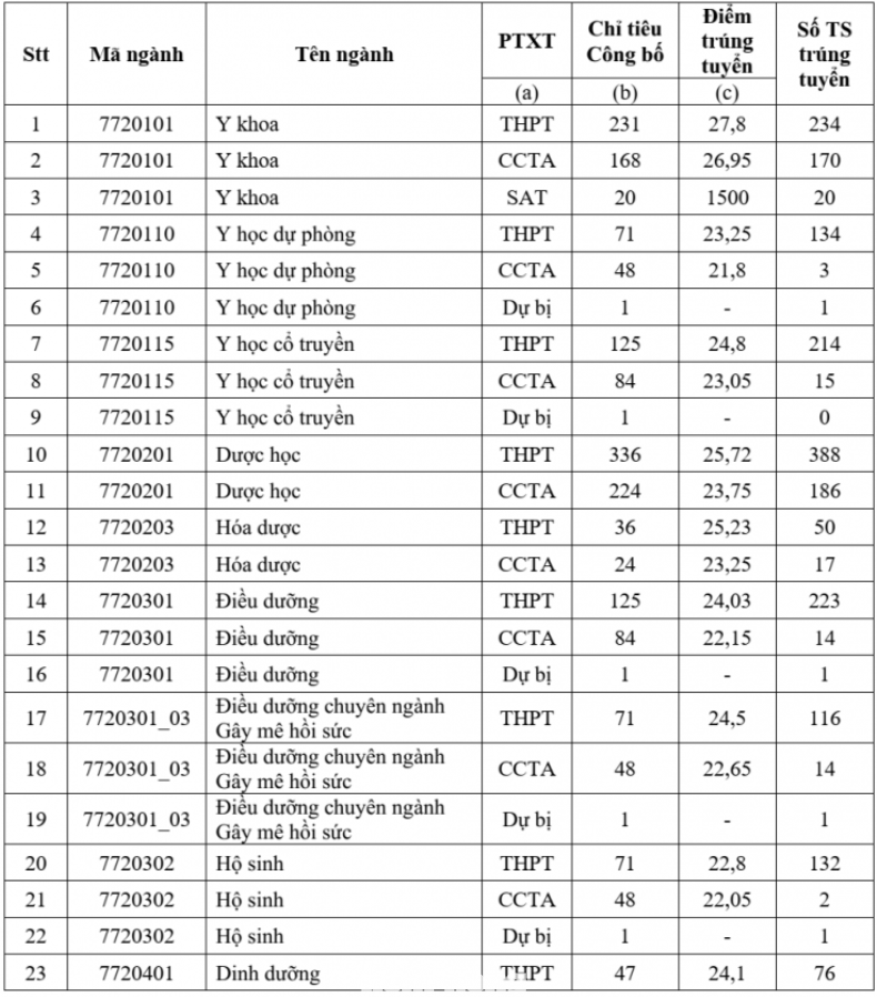 Cụ thể, tại Trường ĐH Y Dược TPHCM, điểm chuẩn bằng phương thức xét điểm thi tốt nghiệp THPT dao động từ 21,45 ở ngành Y tế công cộng đến 27,8 điểm của ngành Y khoa. Điểm chuẩn cụ thể của các ngành như sau: