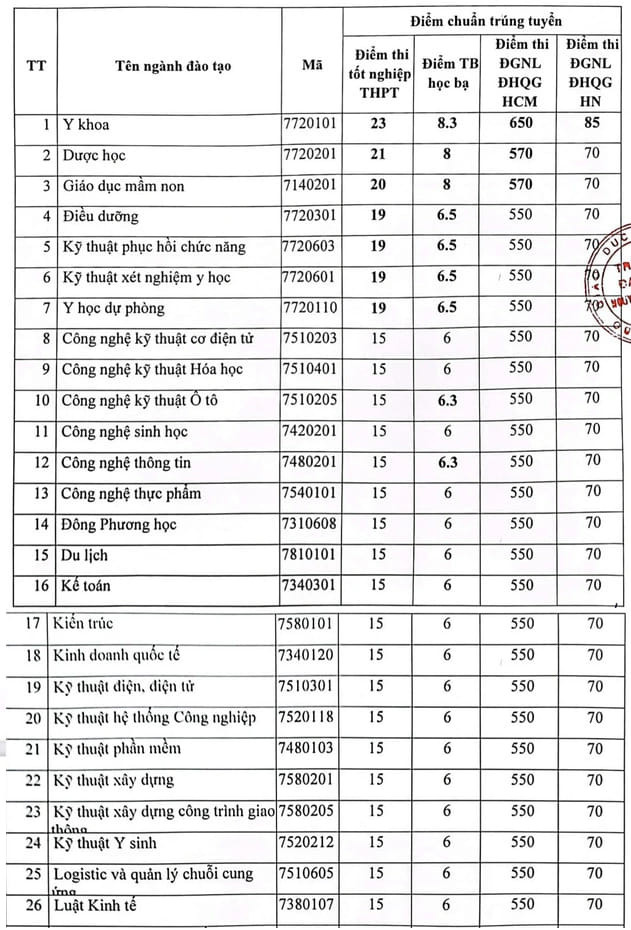 Nhìn chung, điểm chuẩn của hầu hết các ngành học năm nay đều không thay đổi so với năm ngoái. Đáng chú ý, ngành cao điểm nhất là Y khoa với 23 điểm, giảm nhẹ so với năm ngoái (năm 2022 là 25 điểm), riêng ngành Giáo dục mầm non tăng 1 điểm. Đa số ngành học đều dao động từ 15 - 19 điểm.