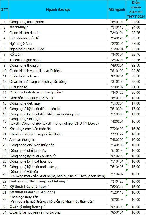 Ngành Công nghệ thực phẩm và Marketing có mức điểm trúng tuyển cao nhất trường với 24 điểm.